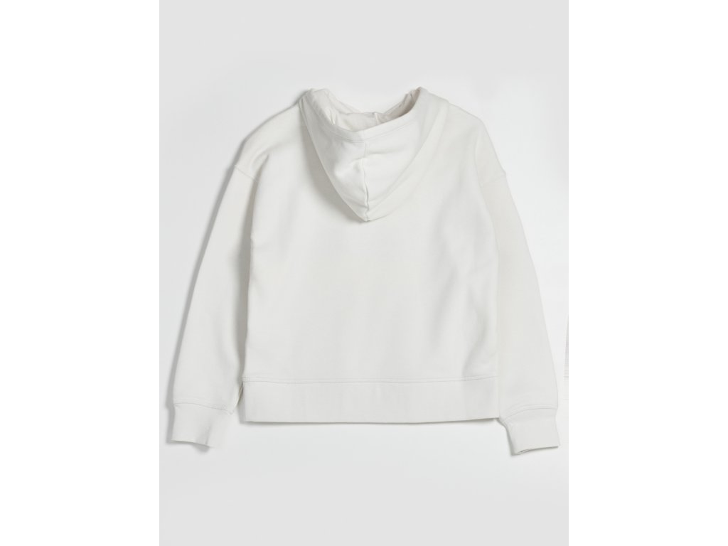 Biela mikina s potlačou dinosaura. Oblieka sa cez hlavu. Kapucňa a obľúbené klokanie vrecko. Široké a pružné náplety. Príjemný materiál s prímesou 9% recyklovaného polyesteru.Dodatočné parametre