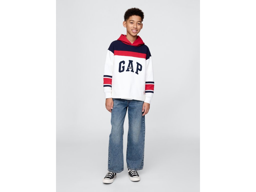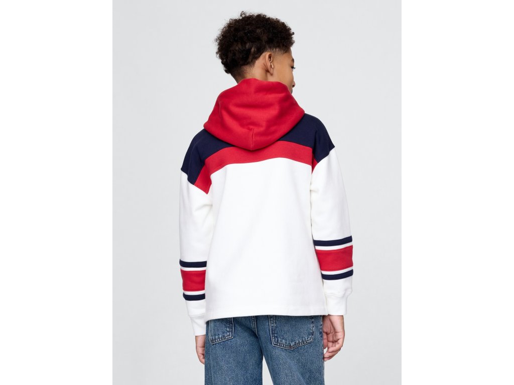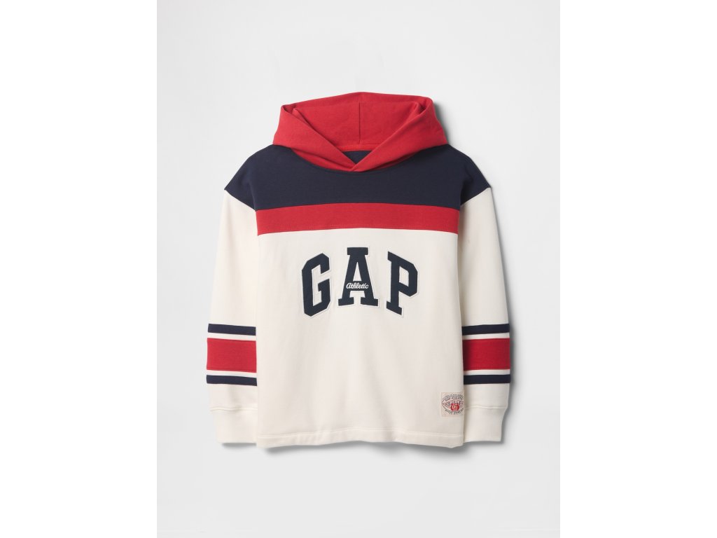 Detská mikina z mäkkého French terry materiálu s prímesou bavlny a 23% recyklovaného polyesteru, ktorý pomáha znižovať množstvo odpadu a šetriť prírodné zdroje. Ponúka extra pohodlie a moderný športový štýl vďaka uvoľnenému strihu, ktorý umožňuje voľnosť pohybu. Má kapucňu, dlhé rukávy a rebrované manžety, ktoré udržia teplo. Na prednej strane sa nachádza ikonické Gap Athletic logo. Športový design dopĺňajú kontrastné farebné bloky a detaily, ktoré dodávajú mikine moderný vzhľad. Má bočné vrecká a rázporky na bokoch, čo zaisťuje pohodlie a voľnosť pri nosení. Vďaka rovnému, pohodlnému strihu sa ľahko kombinuje s teplákmi alebo džínsami. Pokiaľ preferujete užší strih, odporúčame zvoliť o jednu veľkosť menšie číslo.Dodatočné parametre
