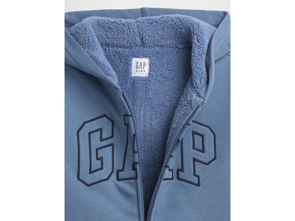 Chlapčenská mikina z mäkkého fleecu so zateplenou sherpa podšívkou vo vnútri kapucne aj tela poskytuje hrejivý komfort aj v chladnejších dňoch. Má dlhé rukávy s rebrovanými manžetami, celoprepínací zips a praktické vrecká. Prednú stranu zdobí ikonické logo Gap, spodný lem je rebrovaný pre lepšie držanie tvaru. Materiál obsahuje 21% recyklovaného polyesteru, ktorý šetrí prírodné zdroje a obmedzuje odpad. Rovný pohodlný strih siaha do pása.Dodatočné parametre
