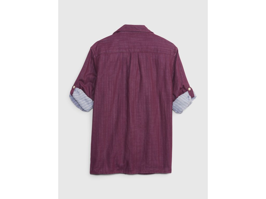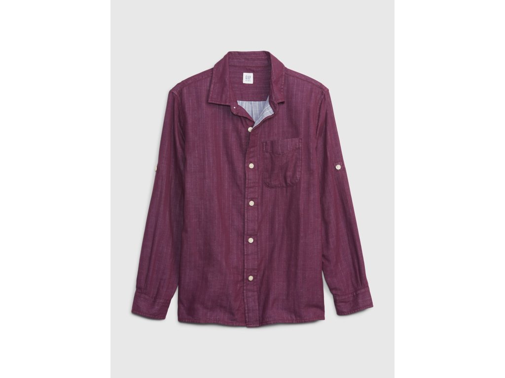 Detská dvojvrstvová košeľa s dlhým rukávom. Horná časť vínová a spodná svetlý prúžok. Dlhé rukávy je možné vyhrnúť na krátke a zapnúť. Pri krku golier. Zapínanie na gombíky v kontrastnej farbe. Na hrudi našité vrecko. 100% bavlna.Dodatočné parametre