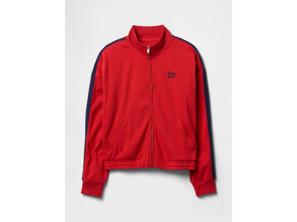 Dámska športová bunda z mäkkého French terry materiálu s bavlnenou zmesou kombinuje pohodlie a štýl. Obsahuje 23% recyklovaného polyesteru, čo prispieva k šetrnejšiemu využívaniu zdrojov a udržateľnejšiemu prístupu k výrobe. Bunda má stojačik, zapínanie na zips po celej dĺžke a dlhé rukávy s voľne strihanými ramenami. Panely s pruhmi na rukávoch dodávajú športový a moderný vzhľad. Na hrudi je umiestnené logo Gap, ktoré dopĺňa design. Praktické šikmé vrecká na bokoch poskytujú priestor na drobnosti, zatiaľ čo elastický lem zaisťuje pohodlné prispôsobenie. Relax strih bundy ponúka rovnú a uvoľnenú siluetu, ktorá siaha k bokom. Ideálna voľba pre voľnočasové aktivity, cestovanie alebo každodenné outfity, ktorá spája funkčnosť, štýl a zodpovednosť voči životnému prostrediu. Pokiaľ preferujete užší strih, odporúčame zvoliť o jednu veľkosť menšiu. Modelky vo veľkosti Gap S meria 172–180 cm, majú obvod pása 60–66 cm a boky 84–97 cm. Modelky vo veľkosti Gap XL meria 172–180 cm, majú obvod pása 86–91 cm a boky 114–127 cm.Dodatočné parametre