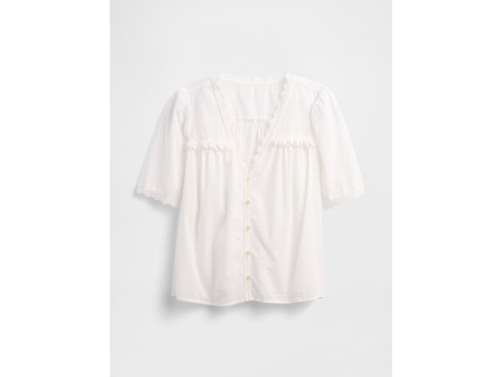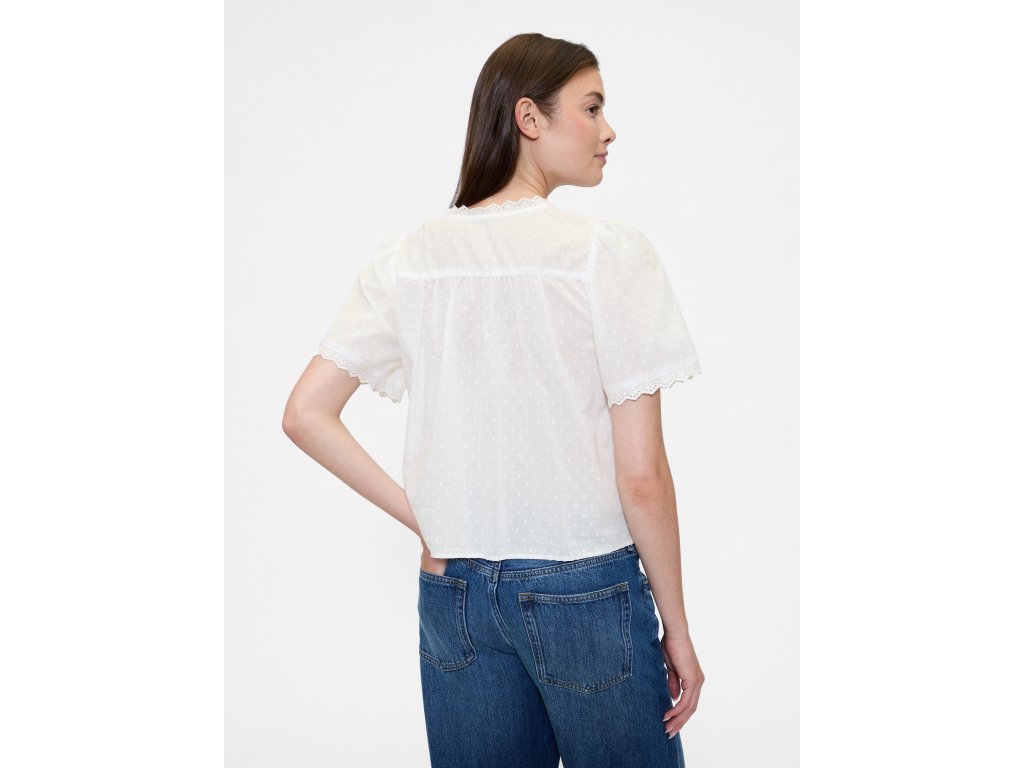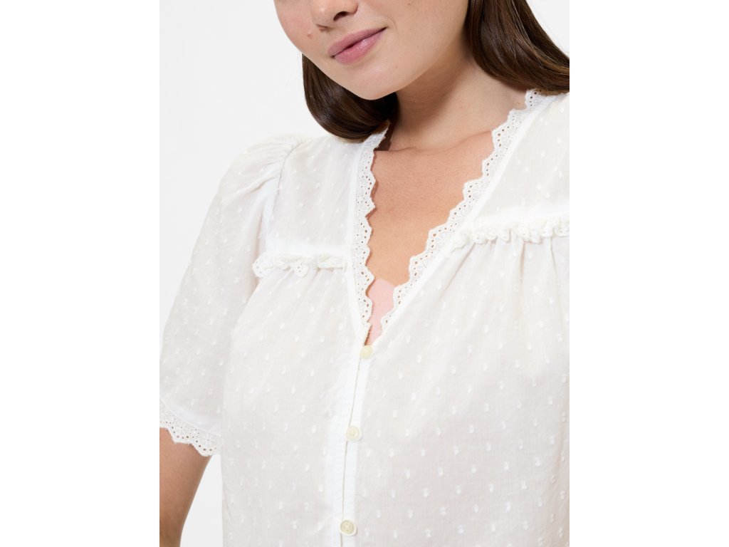 Dámska blúzka z ľahkej bavlnenej tkaniny - vzdušná a príjemná na nosenie. Krátke naberané rukávy zdobené jemnou čipkou. Výstrih do V s volánikovou čipkou a jemným riasením. Zapínanie na gombíky po celej dĺžke. Rovný, pohodlný strih, dĺžka do oblasti bokov. Vyrobená v továrni zapojenej do programov RISE a P.A.C.E. – podpora rodovej rovnosti, lepšie pracovné podmienky a profesionálny rozvoj žien. Romantický a univerzálny kúsok - ľahko skombinujete s džínsami aj elegantnými nohavicami.Dodatočné parametre