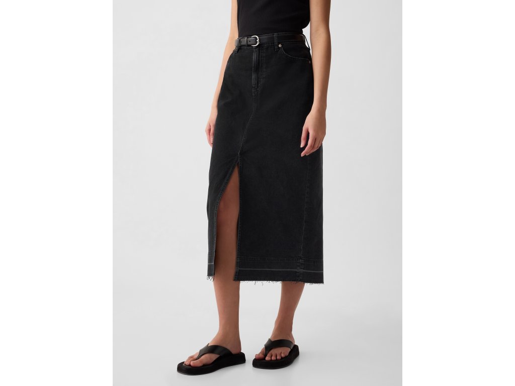 Džínsová midi sukne. Pevný pás s pútkami na opasok. Štýl s 5 vreckami. So zapínaním na gombík a zips. Rozparok.Dodatočné parametre