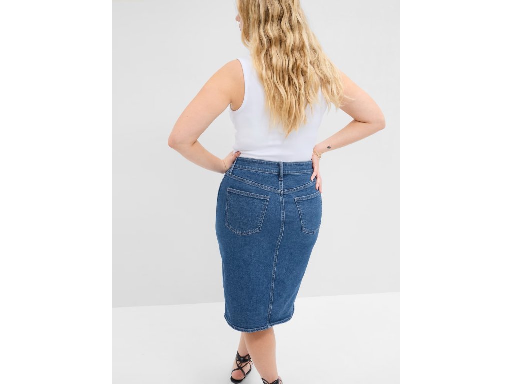 Džínsová midi sukne. Pevný pás s pútkami na opasok. Štýl s 5 vreckami. So zapínaním na gombík a zips. Rozparok.Dodatočné parametre