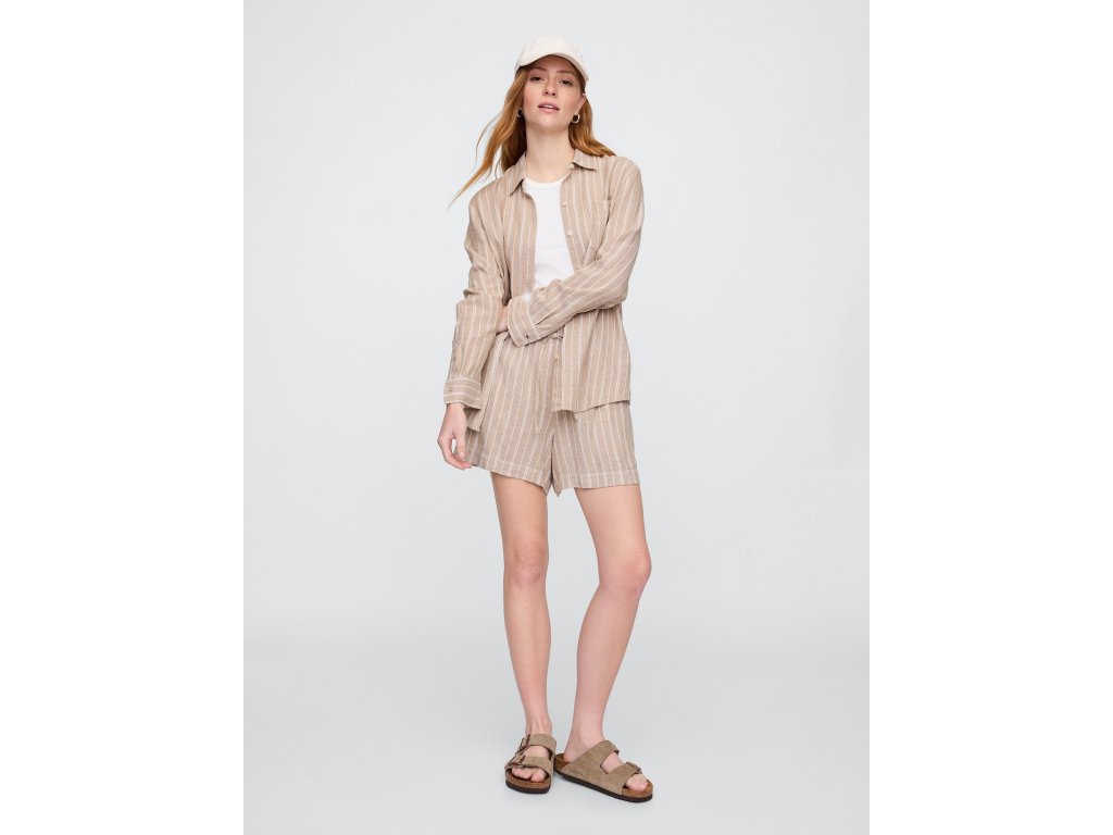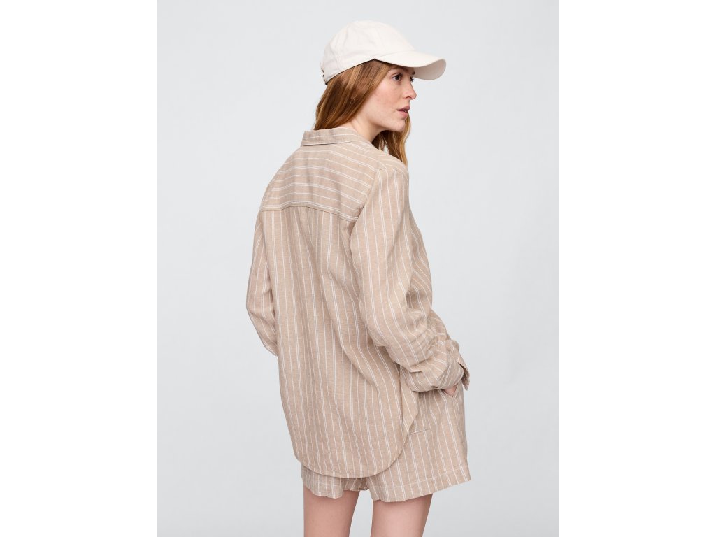 Dámska košeľa z ľahkej zmesi ľanu je štýlovou voľbou na každodenné nosenie. Má dlhé rukávy s manžetami na gombíky, klasický golier a zapínanie po celej dĺžke. Praktické náprsné vrecko pridáva elegantný detail. Zaoblený spodný lem s mierne predĺženou zadnou časťou umožňuje nosiť košeľu zastrčenú aj voľne. Rovný, uvoľnený strih poskytuje pohodlie, zatiaľ čo dĺžka siahajúca k bokom zaisťuje univerzálnosť. Ideálne pre ležérne aj formálne outfity a skvele doplní každý šatník.Dodatočné parametre