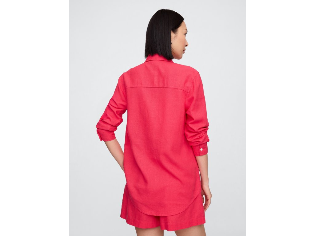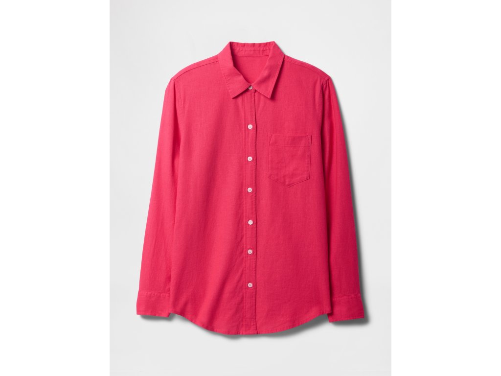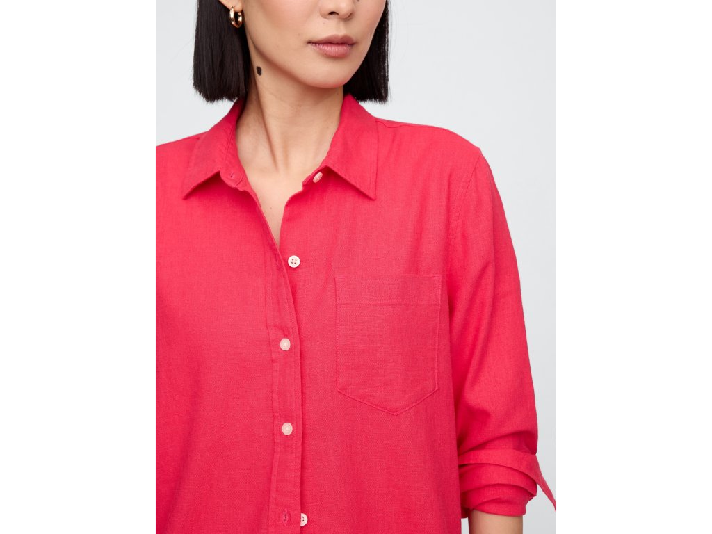 Dámska košeľa z ľahkej zmesi ľanu je štýlovou voľbou na každodenné nosenie. Má dlhé rukávy s manžetami na gombíky, klasický golier a zapínanie po celej dĺžke. Praktické náprsné vrecko pridáva elegantný detail. Zaoblený spodný lem s mierne predĺženou zadnou časťou umožňuje nosiť košeľu zastrčenú aj voľne. Rovný, uvoľnený strih poskytuje pohodlie, zatiaľ čo dĺžka siahajúca k bokom zaisťuje univerzálnosť. Ideálne pre ležérne aj formálne outfity a skvele doplní každý šatník.Dodatočné parametre