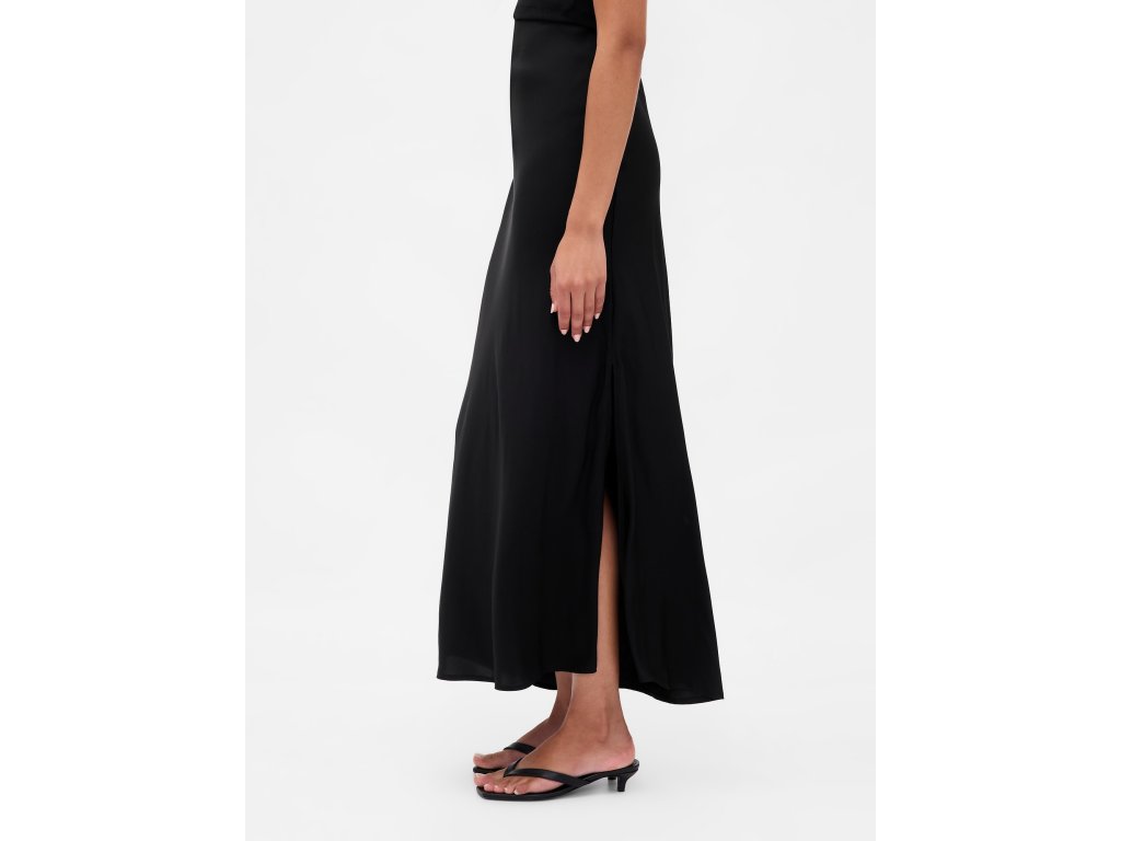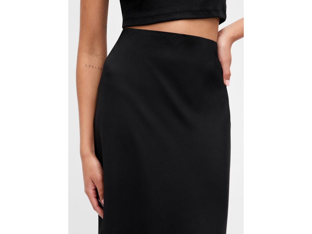 Dámska saténová sukňa s jemným leskom a splývavým strihom je elegantnou voľbou pre každodenný outfit aj špeciálne príležitosti. Hladká keprová tkanina krásne kopíruje postavu, pričom strih zošikma zaisťuje prirodzený pohyb a lichotivý vzhľad. Pružný pás poskytuje pohodlie po celý deň, zatiaľ čo postranný rozparok dodáva sukni ženskosť a voľnosť pri chôdzi. Vyrobená zo 100% viskózových vlákien LENZING™ ECOVERO™, ktoré pochádzajú zo zodpovedných zdrojov a majú nižší dopad na životné prostredie ako bežná viskóza. Produkt vznikol v továrni zapojenej do programu RISE, ktorý podporuje rovnosť a posilňovanie postavenia žien v módnom priemysle. Slim fit: úzky strih v páse a na bokoch s rovným zakončením.Dodatočné parametre