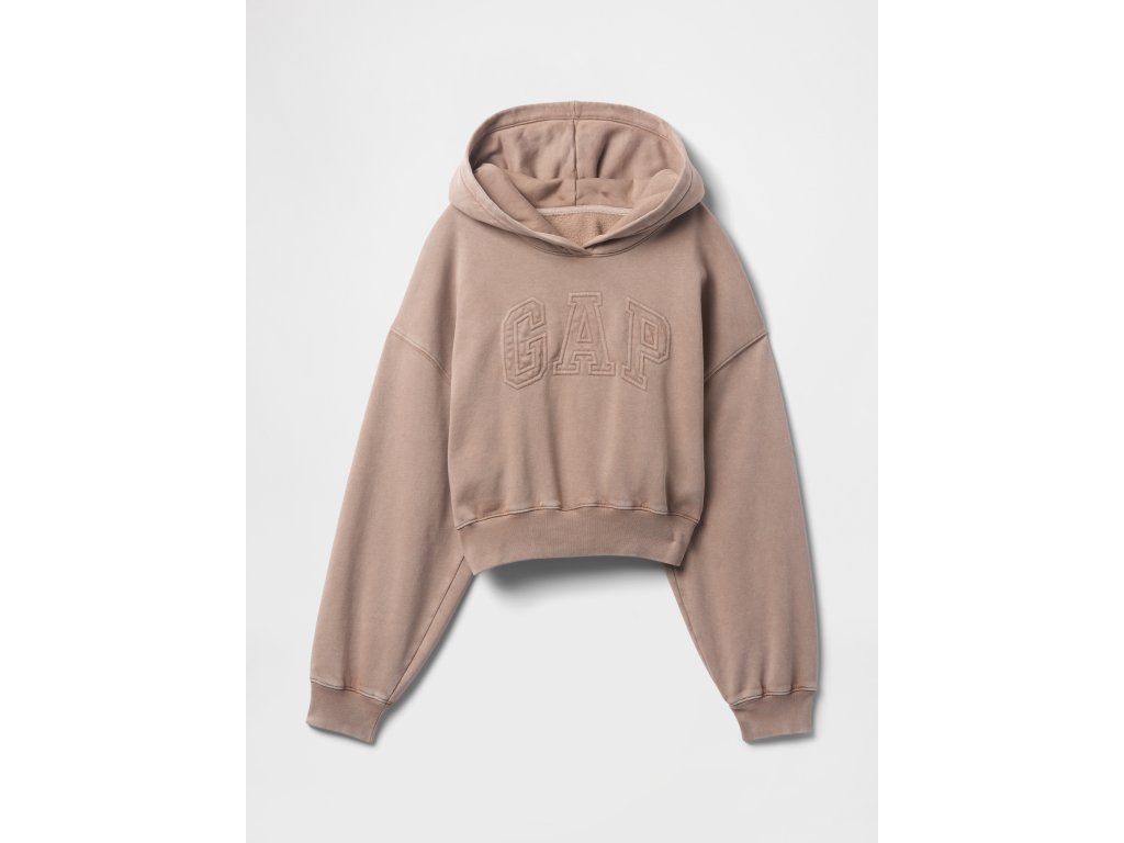 Dámska skrátená mikina s kapucňou z mäkkého fleecu a bavlnenej zmesi je moderným a pohodlným kúskom pre každodenný štýl. Mikina má kapucňu, dlhé rukávy s nízko posadenými ramenami a rebrované manžety, ktoré zaisťujú pohodlie a dotvárajú uvoľnený vzhľad. Na prednej strane ju zdobí ikonické logo Gap. Rebrovaný spodný lem zvýrazňuje skrátený strih siahajúci do pása, zatiaľ čo oversize strih poskytuje voľnosť a maximálne pohodlie. Mikina je vyrobená z 23% recyklovaného polyesteru, čo prispieva k znižovaniu spotreby zdrojov a odpadu. Tento produkt bol vytvorený vo výrobni, ktorá podporuje rodovú rovnosť a posilnenie postavenia žien prostredníctvom programov RISE a P.A.C.E. od Gap Inc. Pre užší strih odporúčame zvoliť o jednu až dve veľkosti menšie. Modelky vo veľkosti S meria 172–180 cm, majú obvod pása 60–66 cm a boky 84–97 cm. Modelky vo veľkosti XL meria 172–180 cm, majú obvod pása 86–91 cm a boky 114–127 cm.Dodatočné parametre