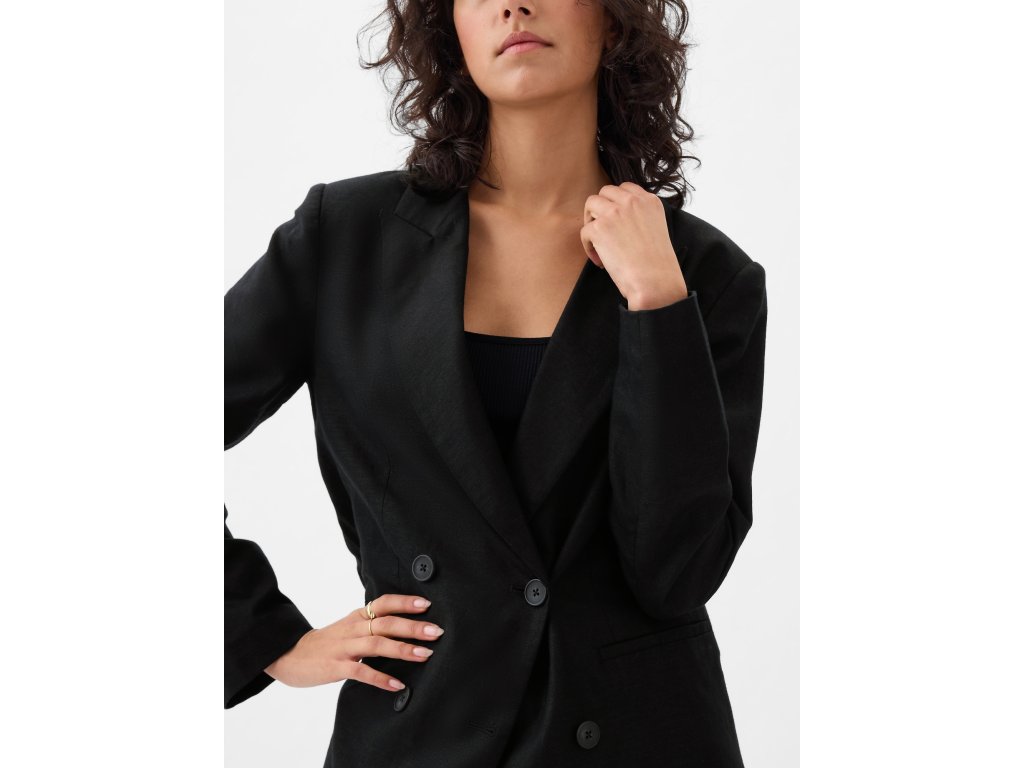 Dámsky blazer s opaskom. Materiál ľan a bavlna. Klopy a dvojradové zapínanie. Opasok na zaväzovanie. Dlhé rukávy a predné vrecká. Pokiaľ rady nosíte priliehavý strih, voľte o číslo menšiu veľkosť. Modelka má na sebe veľkosť S. Miery: výška 180 cm, pás 66 cm, boky 97 cmDodatočné parametre