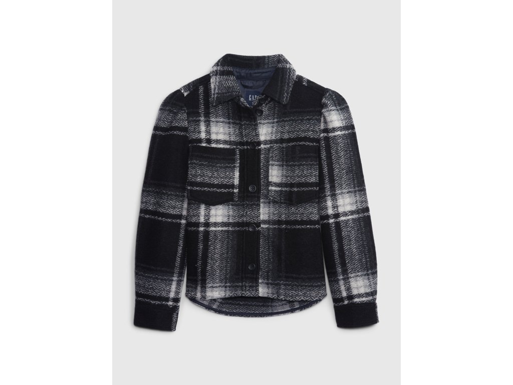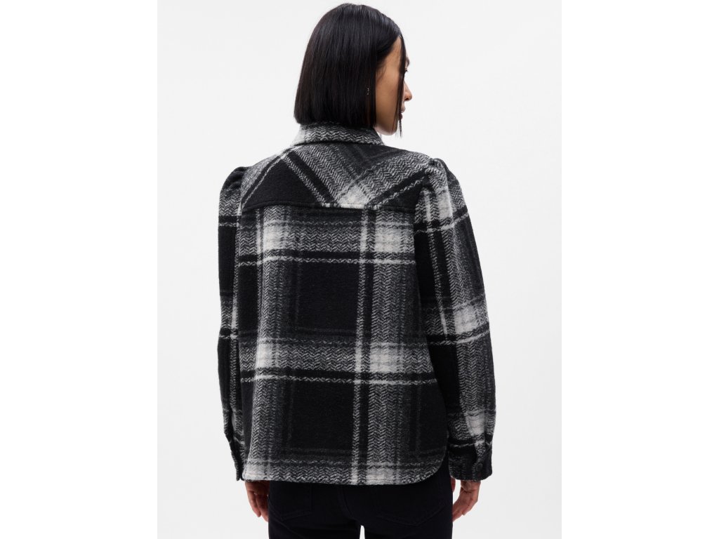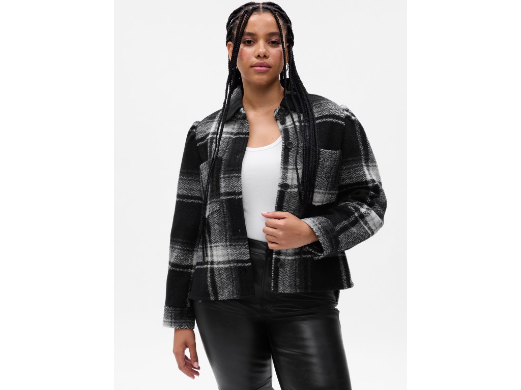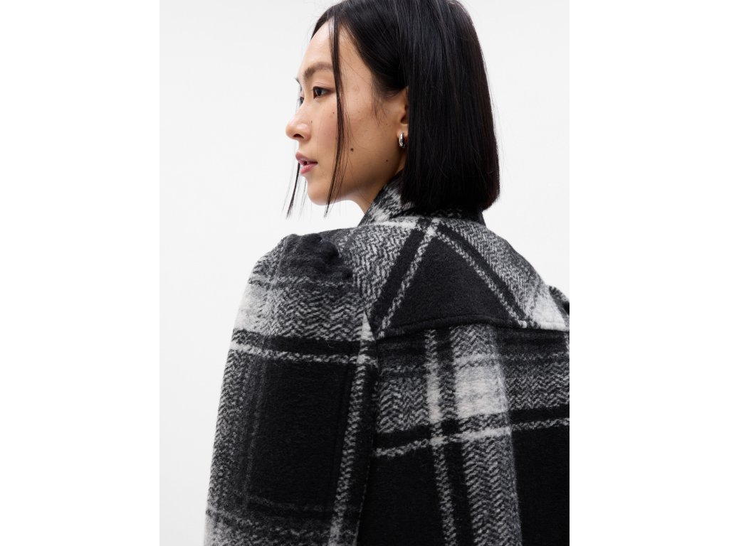 Vlnená kockovaná bunda. Košeľový golier a zapínanie na gombíky. Na hrudi našité dve vrecká. Dlhé naberané rukávy s manžetou. Zaoblený spodný lem.Dodatočné parametre