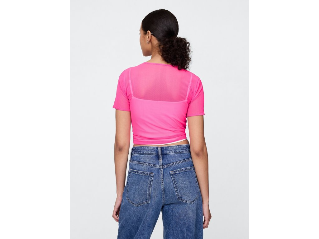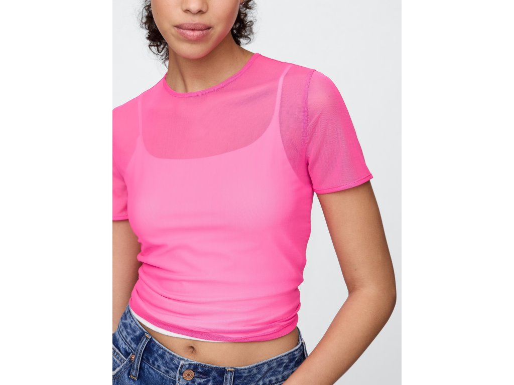 Dámske ultra crop tričko zo strečovej sieťoviny je odvážny a štýlový kúsok, ktorý zvýrazní siluetu a dodá každému outfitu moderný výraz. Ľahká, pružná sieťovina príjemne obopína telo a vytvára hladkú líniu, ktorá sa skvele hodí na vrstvenie alebo samostatné nosenie. Ultra skrátená dĺžka siahajúca nad pás krásne vynikne v kombinácii s nohavicami alebo sukňou s vyšším pásom. Priliehavý strih, okrúhly výstrih a krátke rukávy tvoria čistý základ, ktorý ľahko doplníte podľa nálady – elegantne, športovo aj výrazne. Modelka vo veľkosti S meria 172–180 cm, má obvod pása 60–66 cm a boky 84–97 cm. Modelka vo veľkosti XL má obvod pása 86–91 cm a boky 114–127 cm.Dodatočné parametre