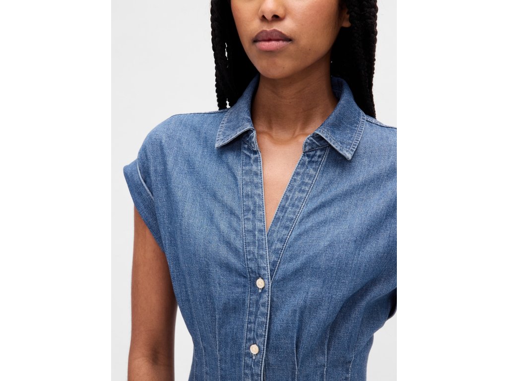 Dámske košeľové šaty z autentického, neelastického denimu. Majú rozhalený golier do V, krátke rukávy s možnosťou vyhrnutia a zapínania na gombíky po celej dĺžke. V páse sú jemne nariasené pre lichotivý fit & flare strih. Predný rozparok dodáva šatám ležérnu eleganciu. Model je súčasťou programu Washwell, ktorý pri praní denimu spotrebuje aspoň o 20 % menej vody oproti bežným metódam, a pochádza z továrne zapojenej do programu RISE podporujúceho rodovú rovnosť a posilnenie postavenia žien. Strih Classic v siluete fit & flare sa ľahko prispôsobí postave. Dĺžka siaha pod kolená. Modelky vo veľkosti S meria 172–180 cm, majú pás 60–66 cm a boky 84–97 cm. Modelky vo veľkosti XL meria 172–180 cm, majú pás 86–91 cm a boky 114–127 cm.Dodatočné parametre