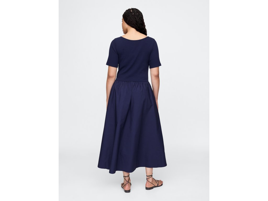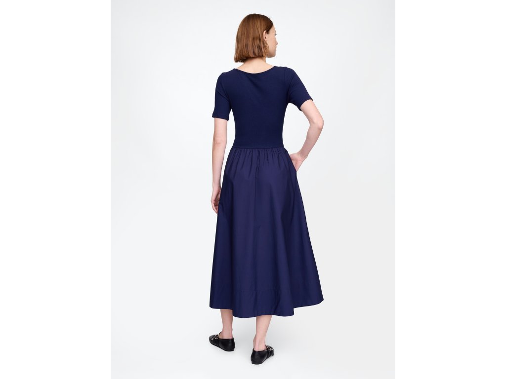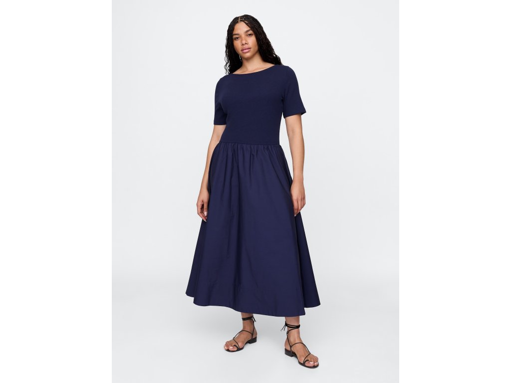 Dámske maxi šaty v modernom štýle kombinujú mäkký a pružný rebrovaný vrchný diel z bavlny a modalu s ľahkou sukňou z popelínu. Elegantný lodičkový výstrih, rukávy k lakťom, elastický pás a praktické vrecká dodávajú šatám ženskú siluetu, ktorá zvýrazňuje krivky a zároveň zaisťuje pohodlie. Sukňa siaha až k členkom a vytvára klasický "fit & flare" strih, ktorý lichotí každej postave. Sukňa je vyrobená zo 100% bavlny overenej programom U.S. Cotton Trust Protocol, ktorý podporuje farmy zamerané na znižovanie spotreby vody a zlepšovanie biodiverzity pôdy. Tieto šaty sú ideálne na každý deň, či už do práce, na prechádzku alebo na voľnočasové aktivity. Modelky nosiacej veľkosť 4 meria 172–180 cm, majú pás 60–66 cm a boky 84–97 cm. Modelky vo veľkosti 16 majú pás 86-91 cm a boky 114-127 cm.Dodatočné parametre