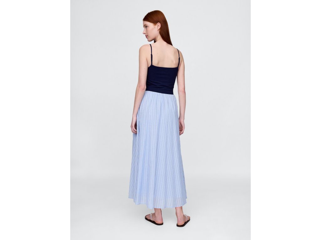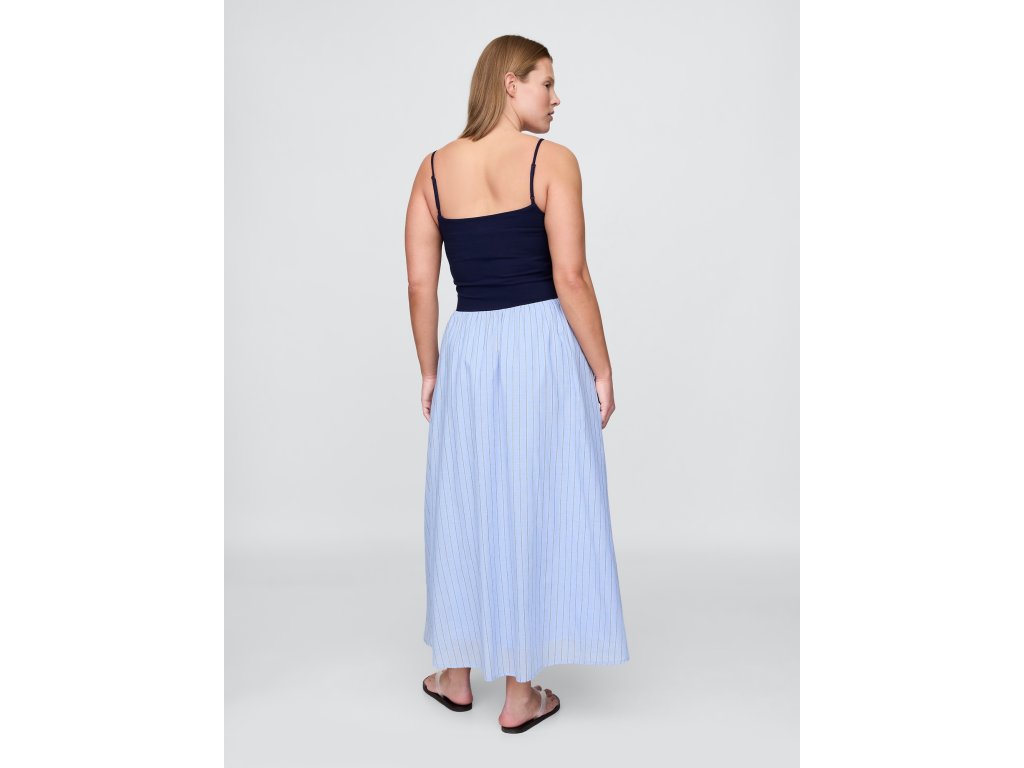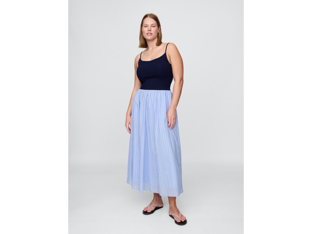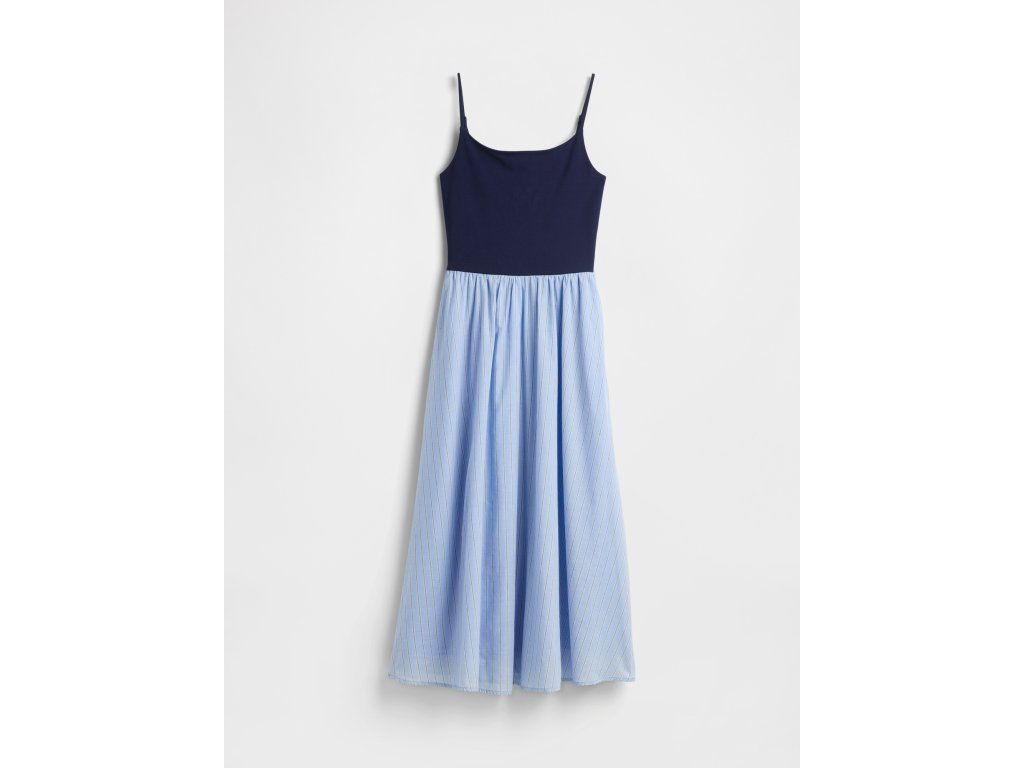 Dámske šaty s kombinovanými materiálmi - bavlnený top a vzdušná sukňa predstavujú ideálne spojenie pohodlia, funkčnosti a letného štýlu. Horná časť je vyrobená zo strečovej bavlny, ktorá jemne obopína telo a prispôsobí sa postave, zatiaľ čo sukňa z ľahkej čistej bavlny s podšívkou zaisťuje príjemnú splývavosť a priedušnosť aj počas teplejších dní. Hlbší okrúhly výstrih a tenké nastaviteľné ramienka poskytujú komfort a možnosť individuálneho nastavenia, čo zvyšuje pohodlie pri nosení. Pružný pás jemne zvýrazní siluetu, zatiaľ čo áčková sukňa sa voľne rozširuje a umožňuje voľnosť pohybu. Štýlový a zároveň praktický detail tvoria bočné vrecká, ktoré oceníte v každodennej prevádzke. Vybrané varianty s celoplošnými pruhmi dodávajú outfitu svieži a hravý vzhľad. Šaty boli vyrobené v rámci iniciatív RISE a P.A.C.E. spoločnosti Gap Inc., ktoré podporujú rodovú rovnosť a profesionálny rozvoj žien v textilnom priemysle prostredníctvom vzdelávania, budovania sebavedomia a rozvoja kľúčových zručností. Fit & flare: Horný diel prilieha, sukňa sa voľne rozširuje pre lichotivú a pohodlnú siluetu. Dĺžka siaha približne ku kolenám. Modelky vo veľkosti S meria 172–180 cm, majú pás 60–66 cm a boky 84–97 cm. Modelky vo veľkosti XL majú pás 86-91 cm a boky 114-127 cm.Dodatočné parametre