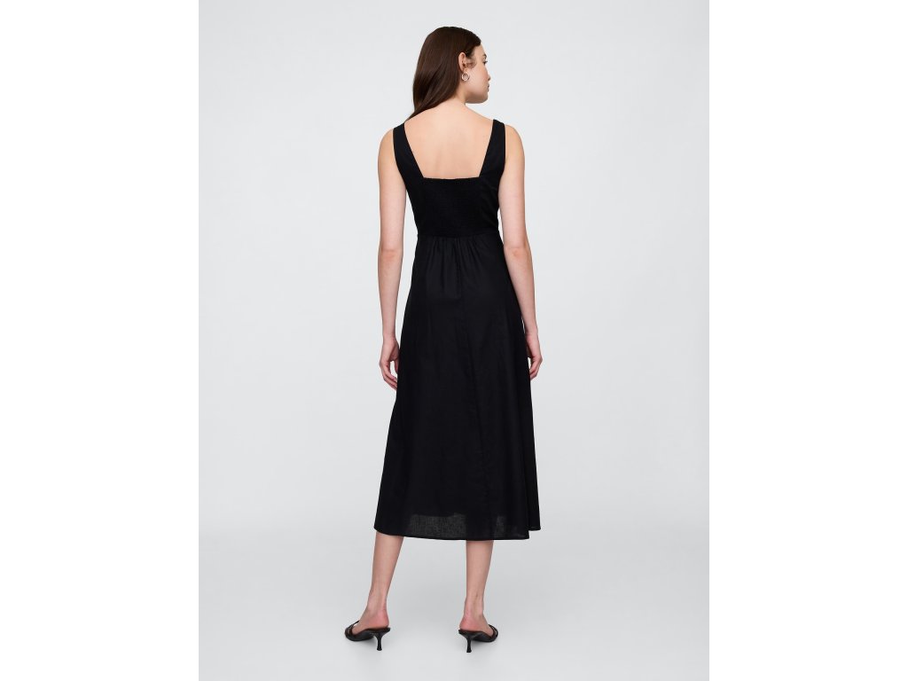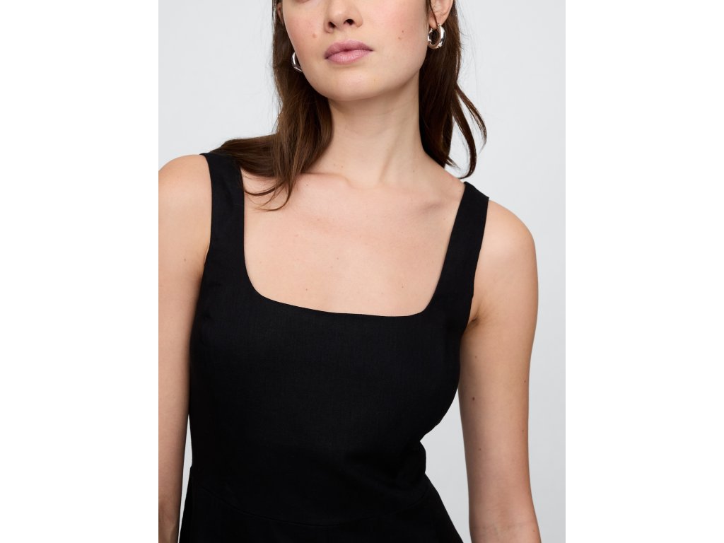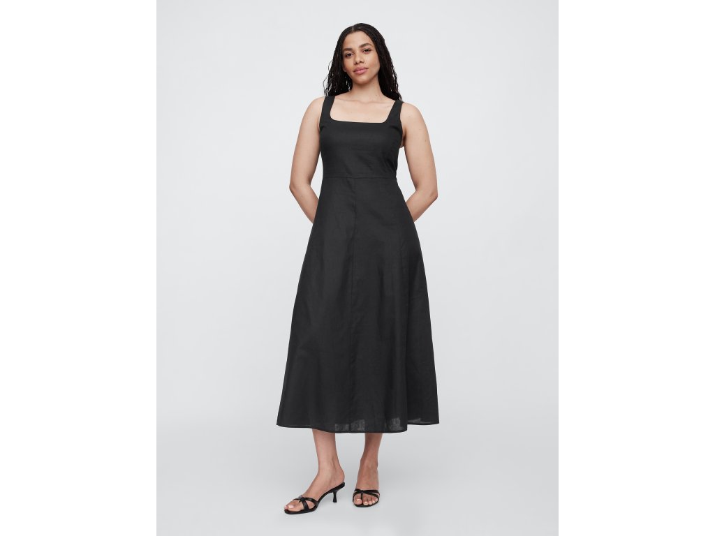 Dámske ľanové midi šaty spájajú ľahkosť, vzdušnosť a nadčasovú eleganciu. Hladká zmes ľanu zaisťuje maximálny komfort a priedušnosť, zatiaľ čo široké ramienka poskytujú pohodlné nosenie. Štvorcový výstrih dodáva šatám moderný a sofistikovaný vzhľad. Voľnejšia silueta v strihu straight fit prináša ležérny štýl a voľnosť pohybu, zatiaľ čo dĺžka pod kolená podčiarkuje nadčasovú eleganciu. Perfektná voľba na leto - ľahké, vzdušné a ľahko kombinovateľné pre každú príležitosť.Dodatočné parametre