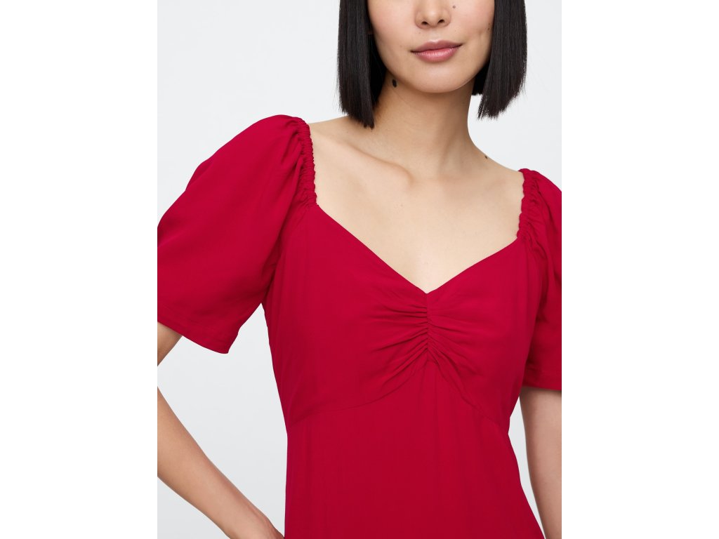 Ľahká tkanina z rayónu, ktorá ponúka pohodlie a vzdušnosť. Krátke balónové rukávy a jemné nariasenie okolo výstrihu v tvare srdca dodávajú šatám romantický a nežný vzhľad. Na spodnom leme je rozparok, ktorý pridáva šmrnc a zaisťuje pohodlný pohyb. Šaty majú rovný strih, ktorý voľne splýva s postavou a siahajú pod kolená, čo ich robí skvelou voľbou pre rôzne príležitosti.Dodatočné parametre