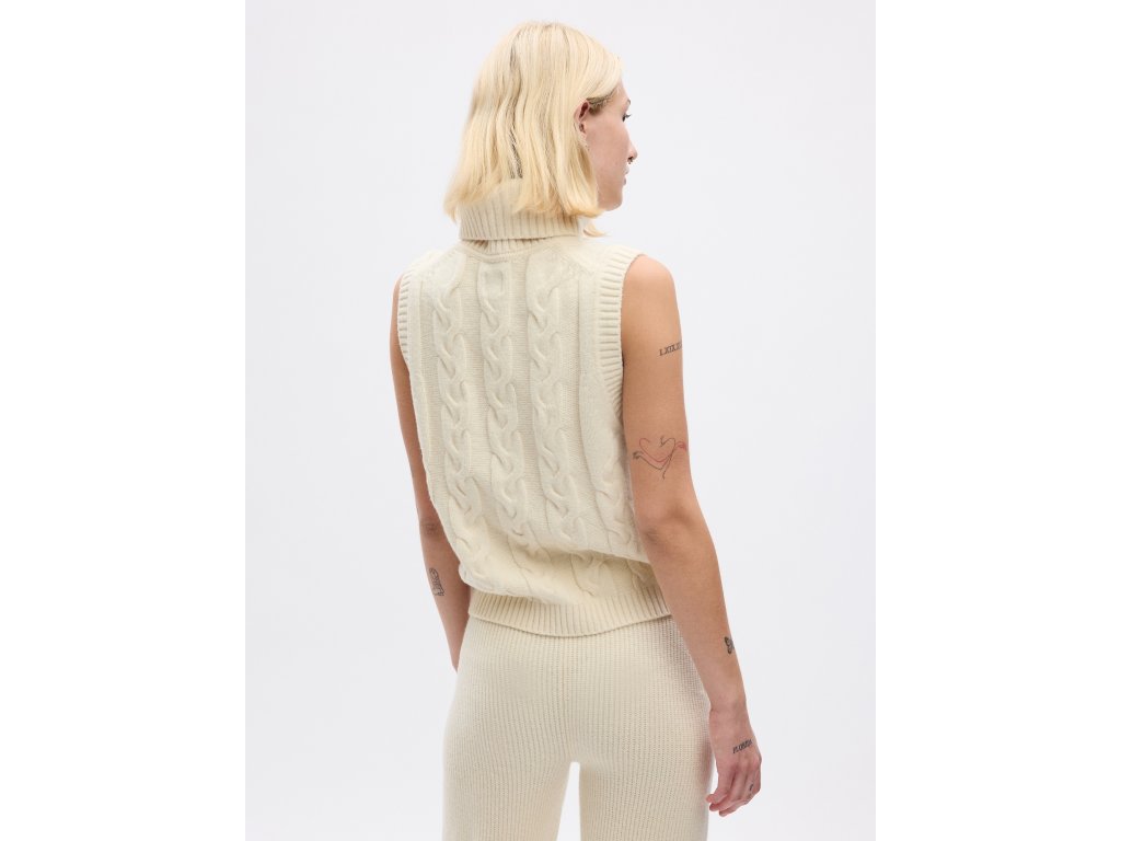 Pletený top s rolákom. Vrkôčikový vzor. Bez rukávov. Jednofarebný.CashSoft je ľahký, hebký, mäkký ako kašmír. Luxusný, ale nenáročný na údržbu.