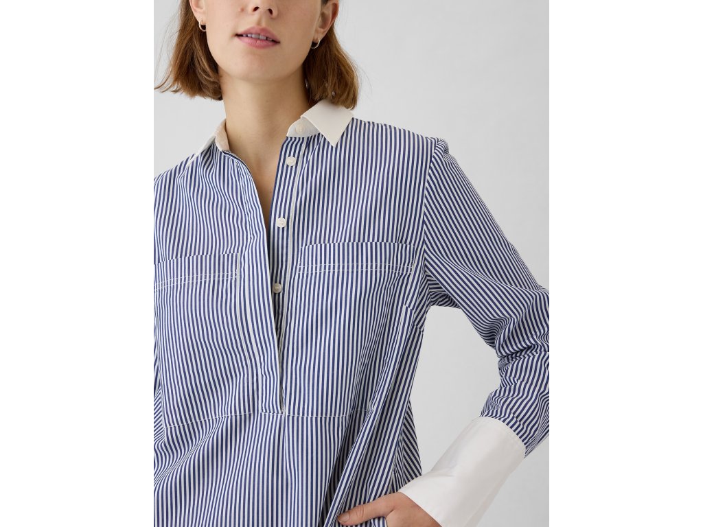 Dámske mäkké bavlnené košeľové mini šaty. Gombíky na prednej časti. Dlhé rukávy s kontrastnými manžetami. Náprsné vrecká. Celoplošná pruhovaná potlač. Vyrobené zo 100% organickej bavlny. Áčkový voľnejší strih. Dĺžka nad kolená. Modelky nosiacej veľkosť S od značky Gap meria 172–180 cm a majú pás 60–66 cm a boky 84–97 cm. Modelky nosiace veľkosť XL od značky Gap meria 172–180 cm a majú pás 86–91 cm a boky 114–127 cm.Dodatočné parametre