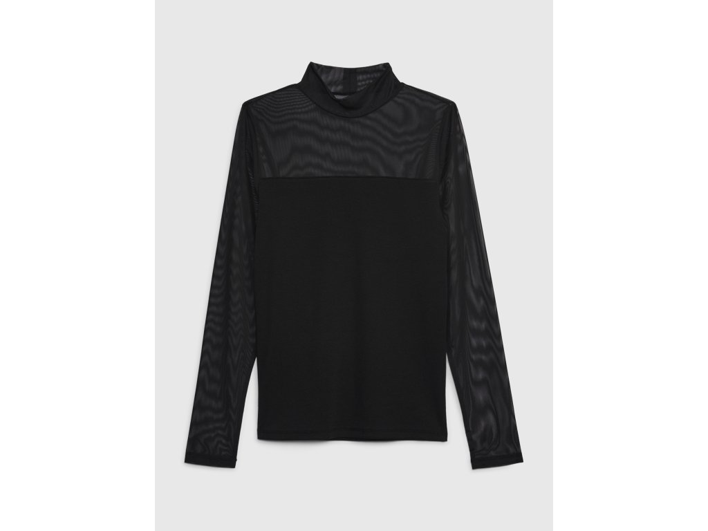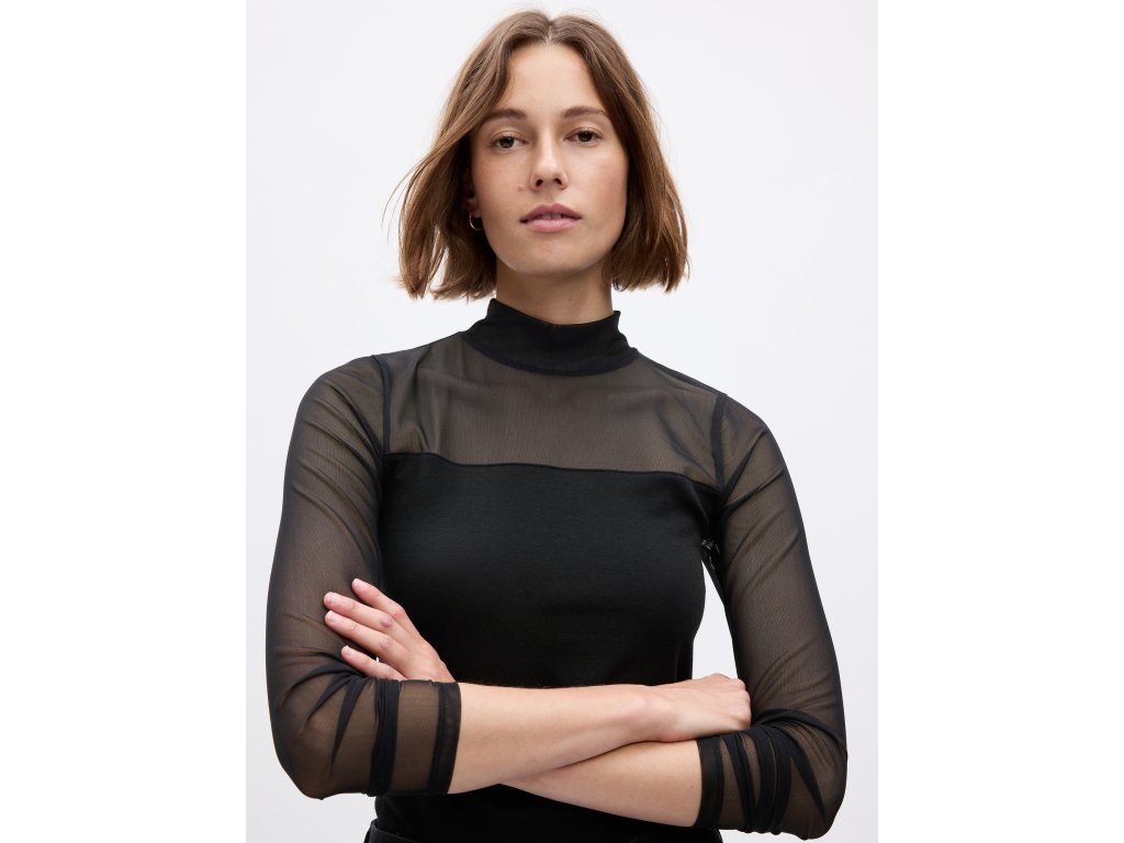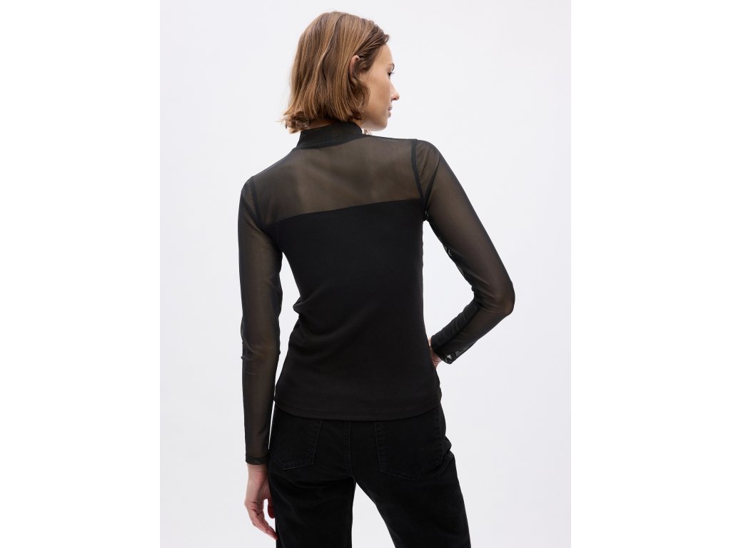 Dámsky priesvitný top. Pri krku stojačik. Dlhé rukávy z priesvitnej sieťoviny. Pružný a príjemný materiál. Priliehavý strih.Dodatočné parametre