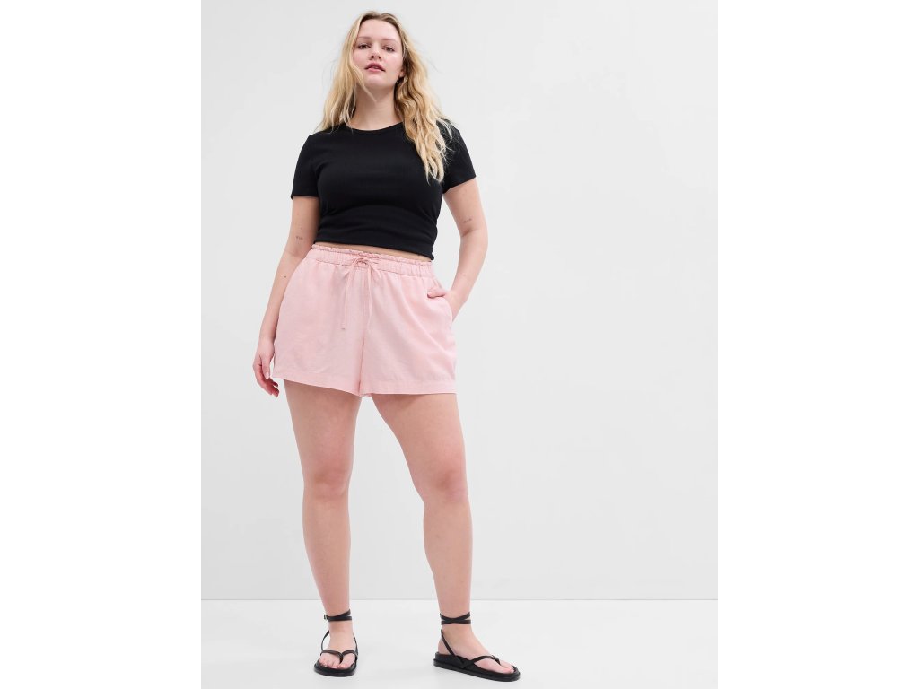 Dámske kraťasy. Materiál ľan a viskóza. Pružný pás so sťahovacou šnúrkou. Predné šikmé vrecká. Stredne vysoký pás. Jednofarebné. Dĺžka vnútorného švu 10 cm.Dodatočné parametre