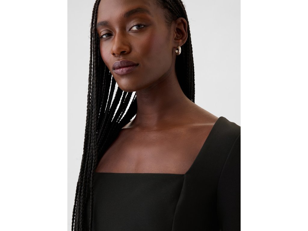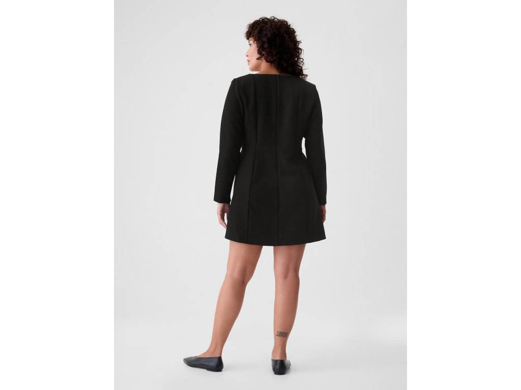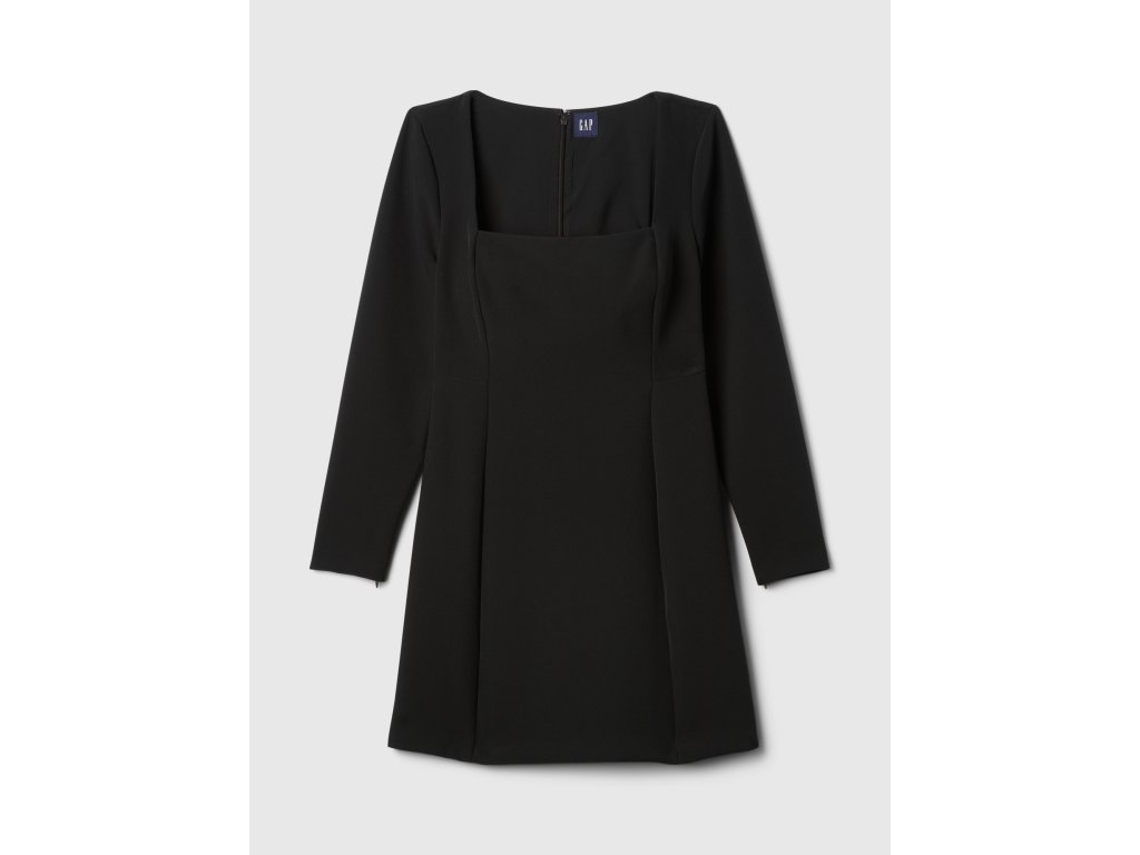 Elegantné mini šaty. Štvorcový výstrih a dlhé rukávy. Moderný a sofistikovaný štýl. Predné švy dodávajú šatám štruktúru. Zdôrazňujúci siluetu. Zadný zips. Priliehavý strih, ktorý obopína telo a smerom k dolnému lemu sa mierne rozširuje. Dĺžka nad kolená. Modelky s veľkosťou S: výška 172–180 cm, obvod pása 60–66 cm a boky 84–97 cm. Modelky s veľkosťou XL výška 172–180 cm, majú obvod pása 86–91 cm a boky 114–127 cm.Dodatočné parametre