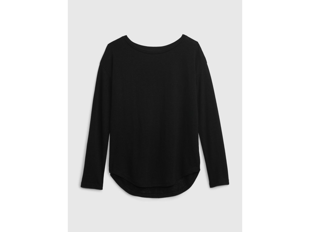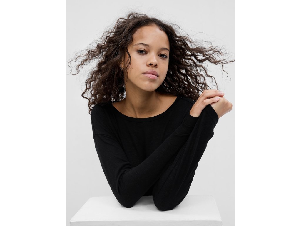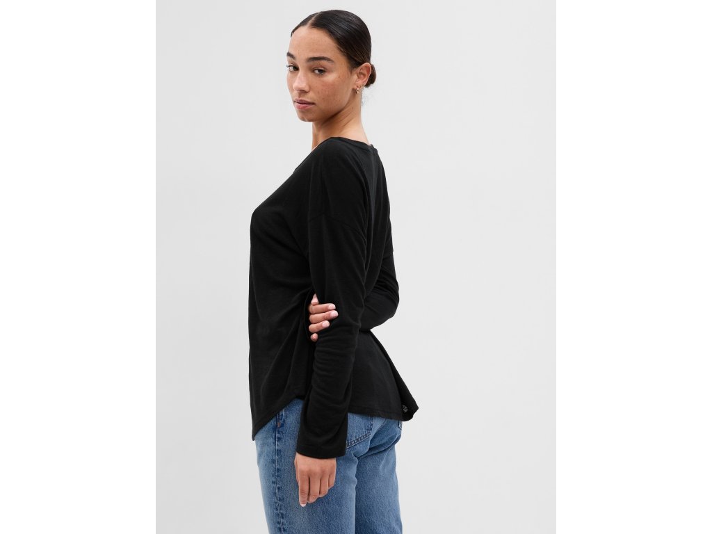 Dámske tričko. Zo zmesi ľanu a polyesteru. Lodičkový výstrih. Dlhé spadnuté rukávy. Voľný rovný strih.Dodatočné parametre