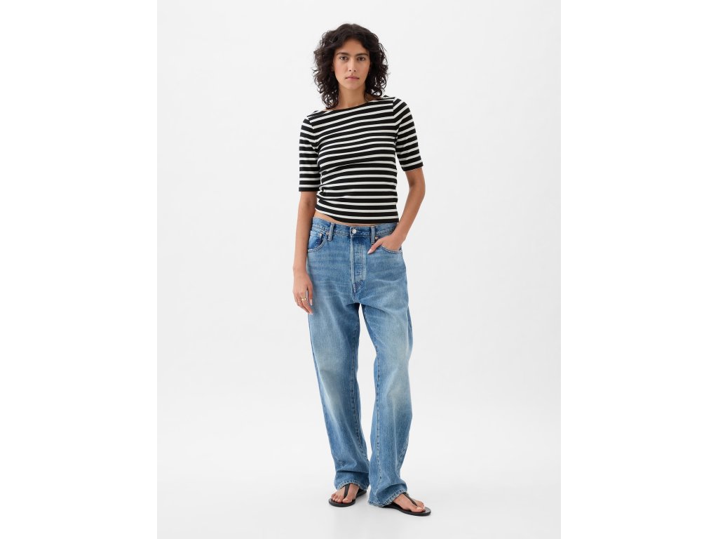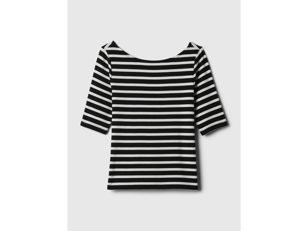 Dámske pruhované tričko. Lodičkový výstrih. Hlboký výstrih na chrbte. Krátke rukávy. Slim strih a crop dĺžka. Príjemný materiál bavlna a modal.Dodatočné parametre