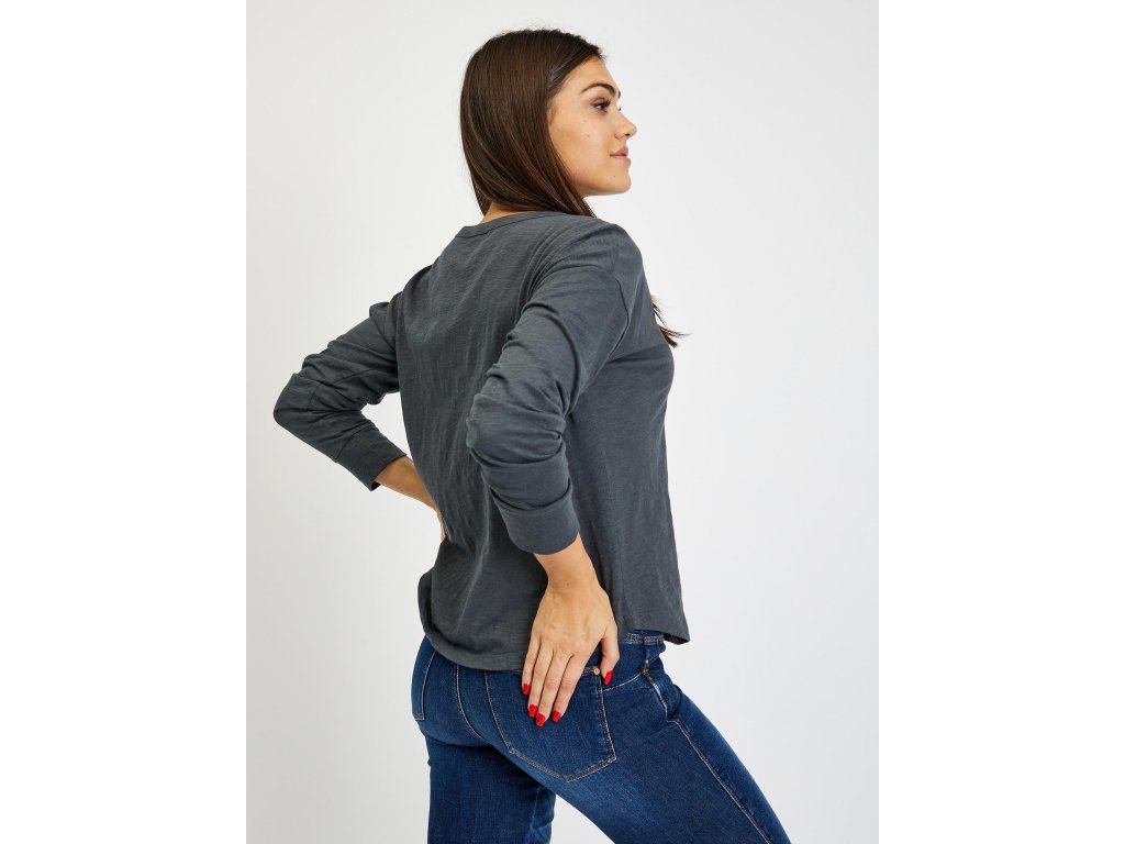 Dámske tričko s drobným logom. Dlhé spadnuté rukávy s nápletom. Okrúhly výstrih a zaoblený spodný lem. Široký a kratší strih.Dodatočné parametre