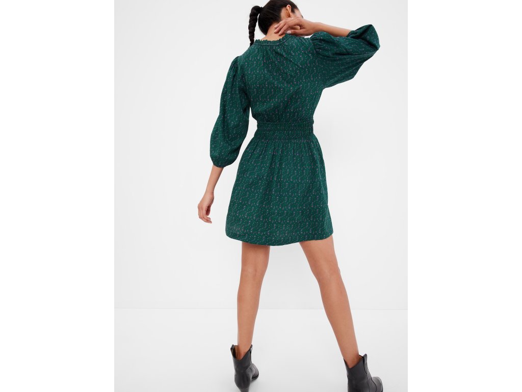 Dámske vzdušné bavlnené mini šaty. Drobný plošný vzor na zelenom podklade. Okrúhly výstrih s drobným volánikom. Výstrih kombinovaný s véčkom a šnúrkou na zaväzovanie. Naberané 3/4 balónové rukávy. Zvýraznený pás s pružným žabičkovaním. Krátka sukňa v áčkovom strihu. 100% bavlna.Dodatočné parametre