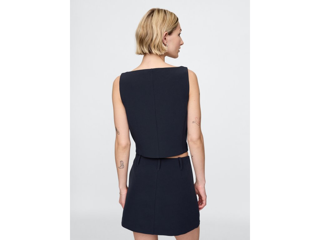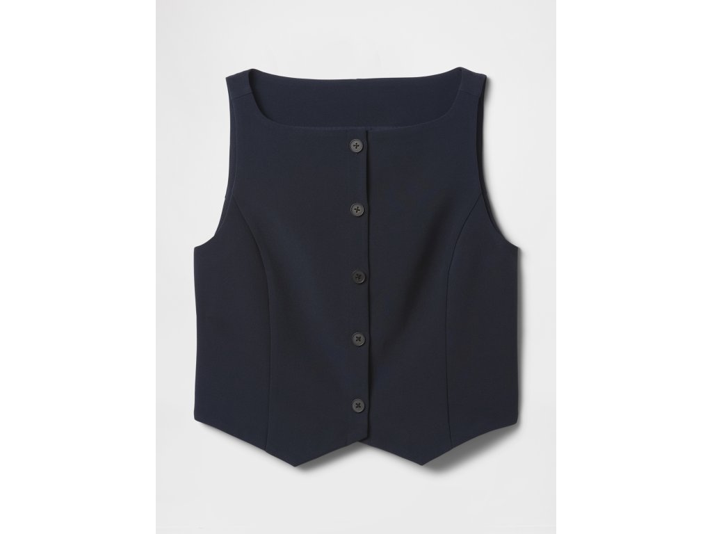 Elegantná a štýlová vesta, ktorá kombinuje pohodlie s ohľaduplnosťou k prírode. Hladký materiál s obojsmernou pružnosťou zaisťuje voľnosť pohybu a perfektné padnutie po celý deň. Lodičkový výstrih, absencia rukávov a zapínanie na gombíky dodávajú veste moderný a sofistikovaný vzhľad. Vyrobená z 95% recyklovaného polyesteru, prispieva k znižovaniu spotreby zdrojov a odpadu oproti tradičným materiálom. Klasický strih vesty sa ľahko prispôsobí rôznym typom postáv a dĺžka do pása z nej robí ideálny kúsok na vrstvenie. Skvelá voľba pre pracovné schôdzky aj voľnočasové aktivity - univerzálny model, ktorý môžete nosiť celý deň. Modelky vo veľkosti S meria 172–180 cm, s pásom 60–66 cm a bokmi 84–97 cm. Modelky vo veľkosti XL majú pás 86-91 cm a boky 114-127 cm.Dodatočné parametre