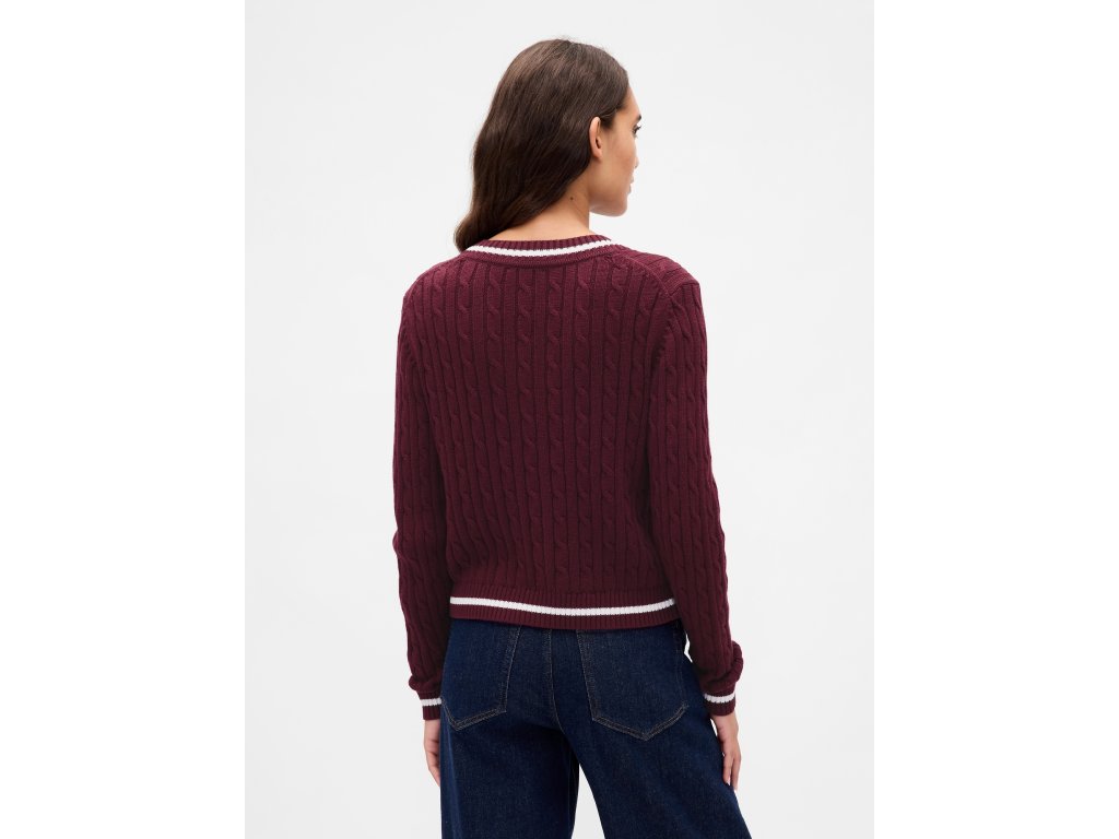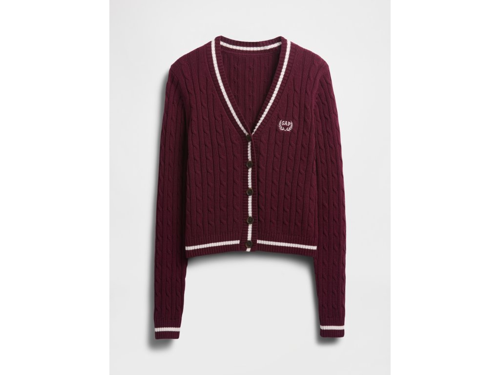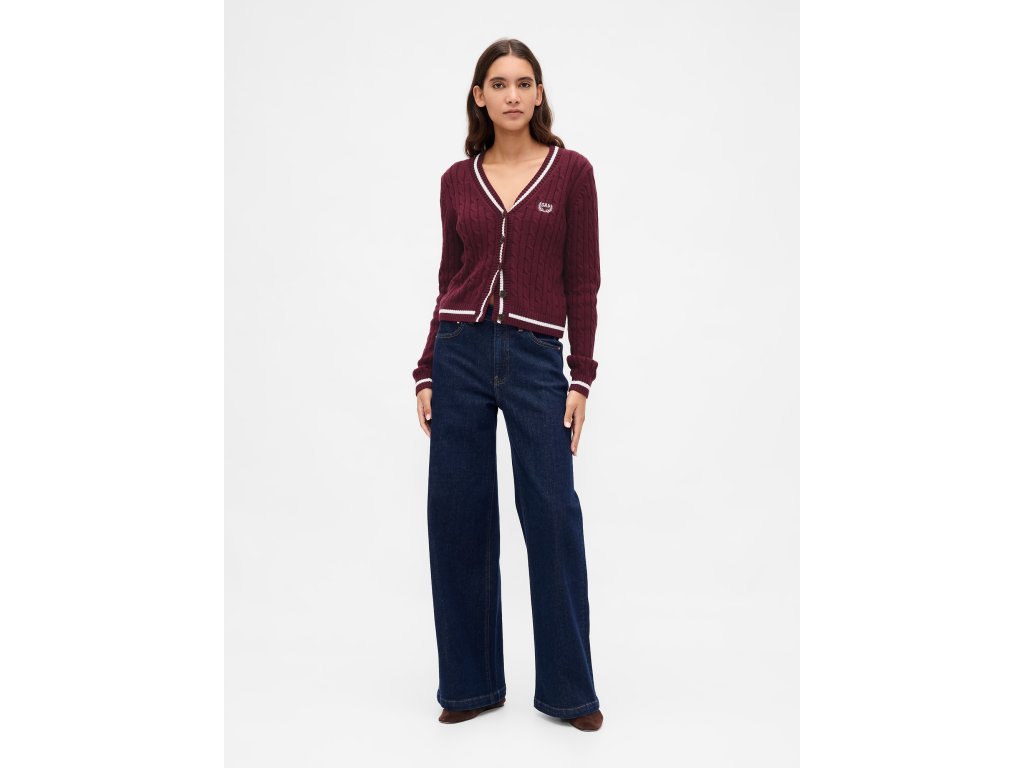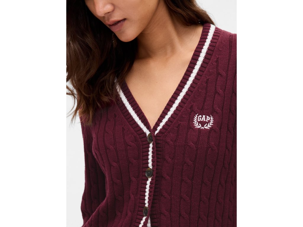 Dámsky kardigan z bavlneného úpletu je pohodlný, mäkký na dotyk a ideálny na každý deň. Má vrkôčikový vzor, výstrih do V, gombíky po celej dĺžke a dlhé rukávy s rebrovanými manžetami. Na hrudi je jemné vyšívané logo GAP. Štýl podčiarkujú kontrastné pruhy na spodnom leme. Rovný strih s kratšou dĺžkou siaha do pása a pekne zvýrazní siluetu. Modelky vo veľkosti S meria 172–180 cm, majú pás 60–66 cm a boky 84–97 cm. Vo veľkosti XL meria 172–180 cm, pás 86–91 cm a boky 114–127 cm.Dodatočné parametre