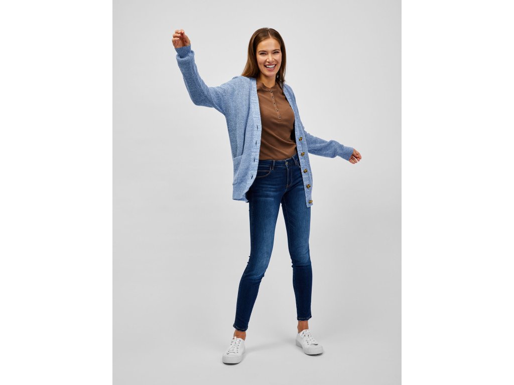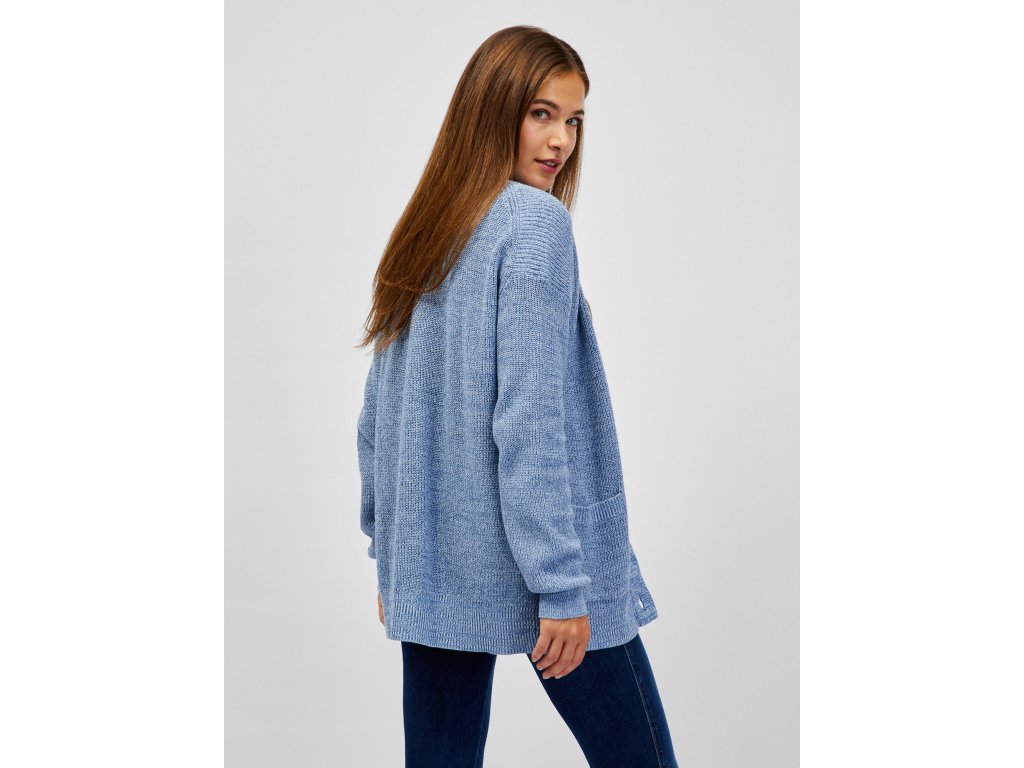 Dámsky kardigan s vreckami. Zapínanie na veľké gombíky. Dlhší strih a výstrih do V. Pružné rebrované náplety.Dodatočné parametre