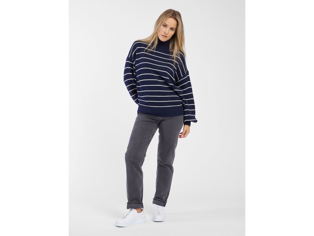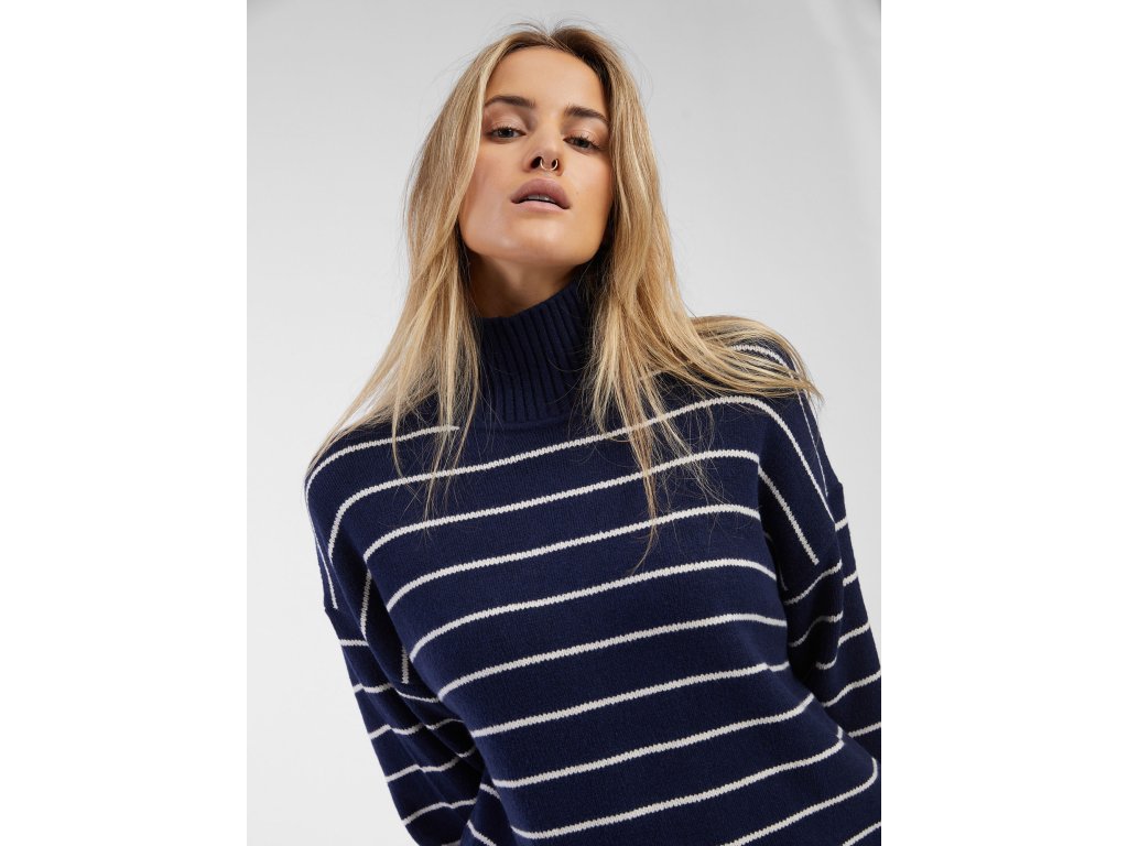 Dámsky pruhovaný sveter. Pri krku rebrovaný stojačik. Spadnuté dlhé rukávy s nápletmi. Mäkká pletenina.CashSoft je ľahký, hebký, mäkký ako kašmír. Luxusný, ale nenáročný na údržbu.