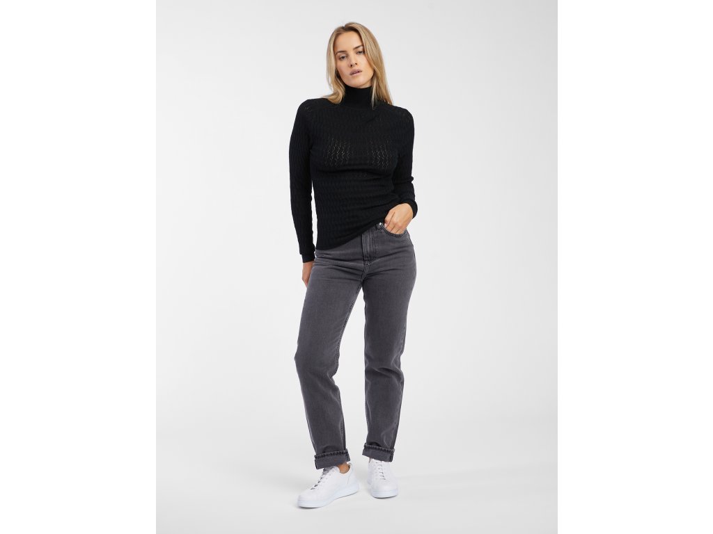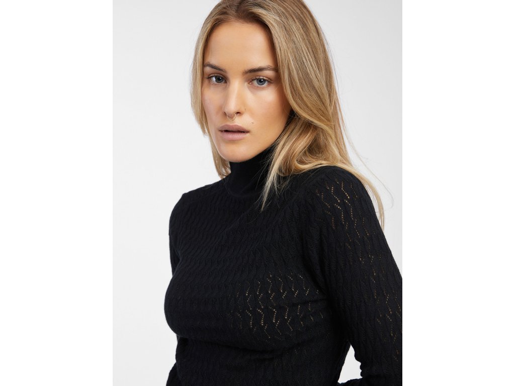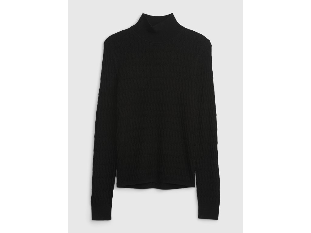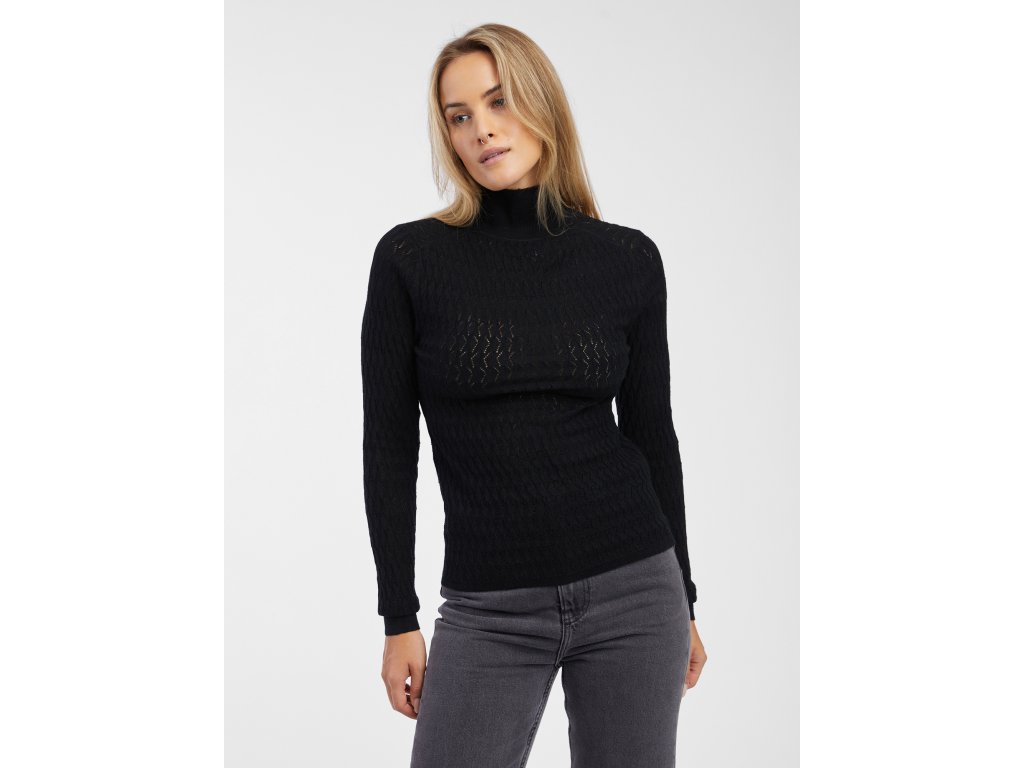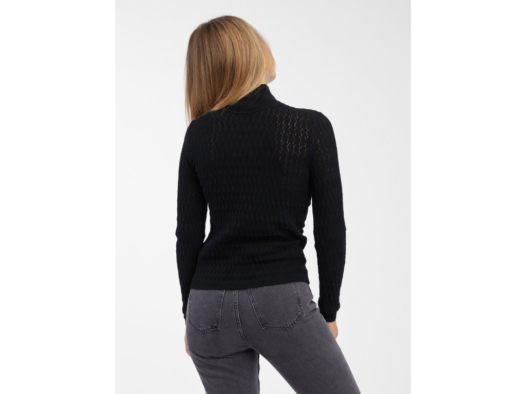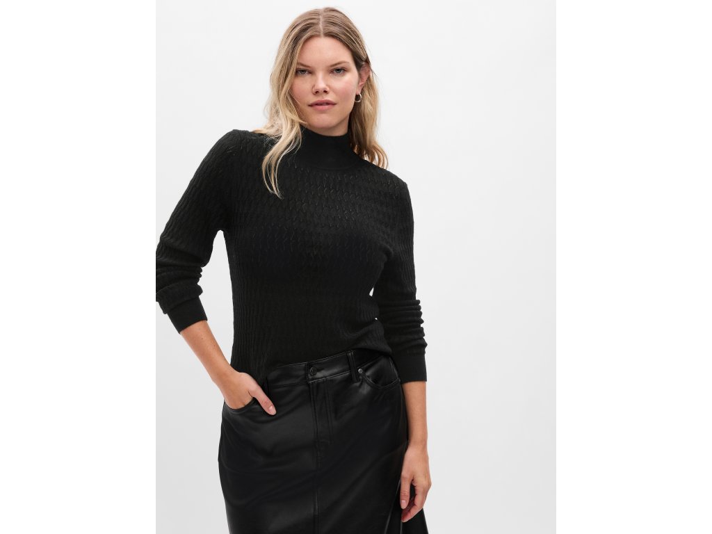 Dámsky jednofarebný sveter. Mäkká pletenina so vzorom. Pri krku rebrovaný stojačik. Dlhé rukávy s nápletmi. S prímesou vlny.Dodatočné parametre