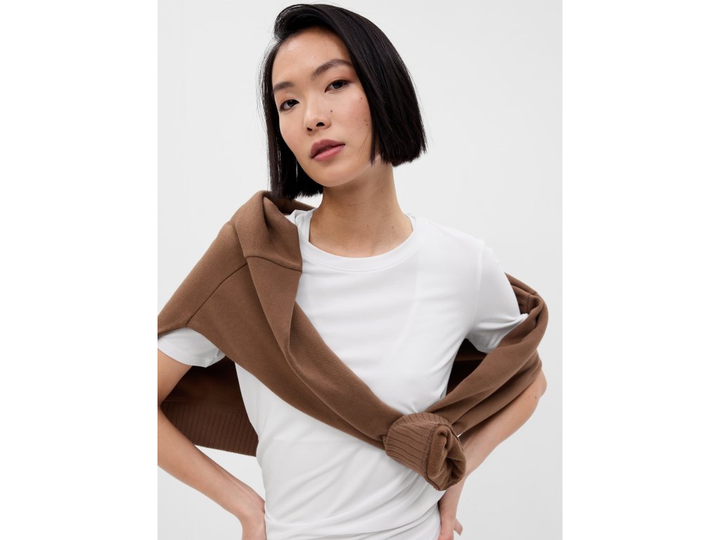 Mäkké strečové dámske športové tričko. Okrúhly výstrih. Krátke rukávy. Naša ľahká a priedušná tkanina s technológiou odvodu vlhkosti, ktorá odvádza pot od tela a udržuje vás v suchu a pohodlí. Rovná silueta s voľným strihom. Dĺžka po boky. Modelky nosiacej veľkosť Gap S sú 172 cm – 180 cm vysoké s pásom 60 cm – 66 cm a bokmi 84 cm – 97 cm. Modelky nosiacej veľkosť Gap XL sú 172 cm – 180 cm vysoké s pásom 86 cm – 91 cm a bokmi 114 cm – 127 cm.Viac z kolekcia GapFit >.