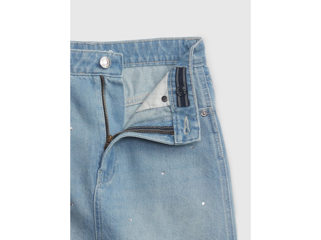 Detská džínsová sukňa. S vysokým pásom. Ozdobená kamienkami. Pevný pás s pútkami na opasok. Zapínanie na zips a gombík. S 5 vreckami. S prímesou recyklovanej bavlny.Dodatočné parametre