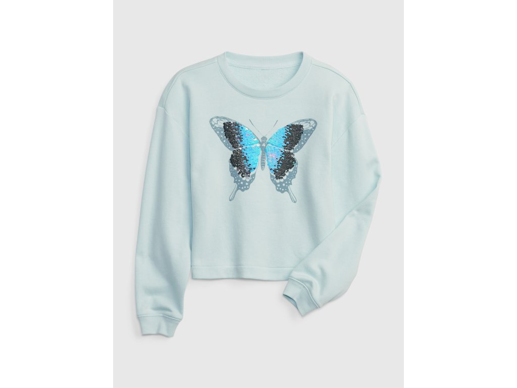 Detská mikina cez hlavu. Na prednej strane motýľ z flitrov. Flitre po uhladení menia farbu. Okrúhly výstrih s pružným lemom. Dlhé spadnuté rukávy s nápletmi. S French Terry.Dodatočné parametre