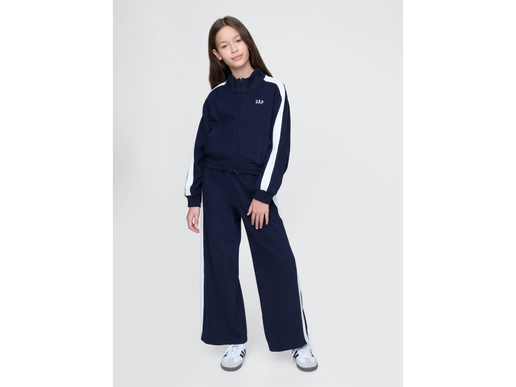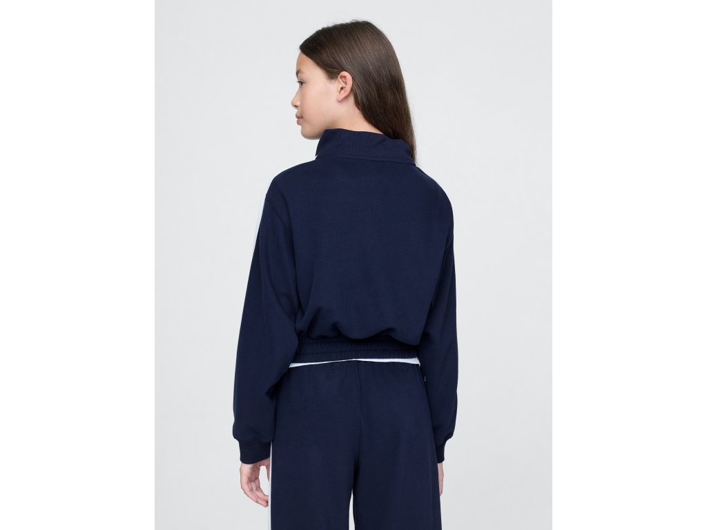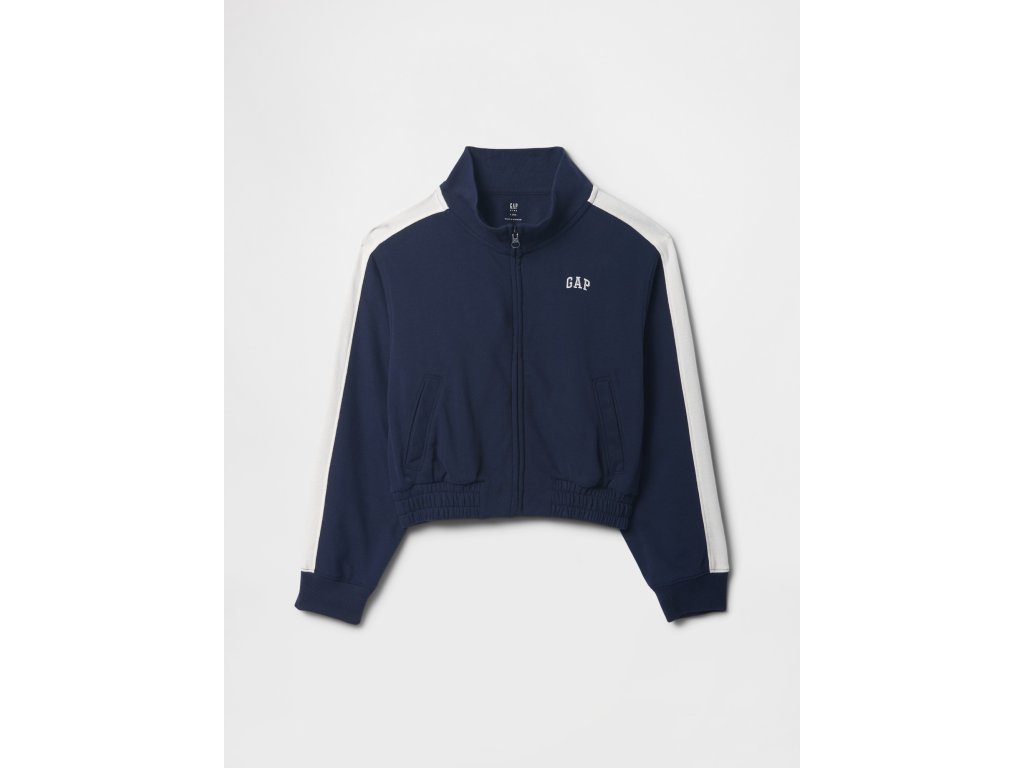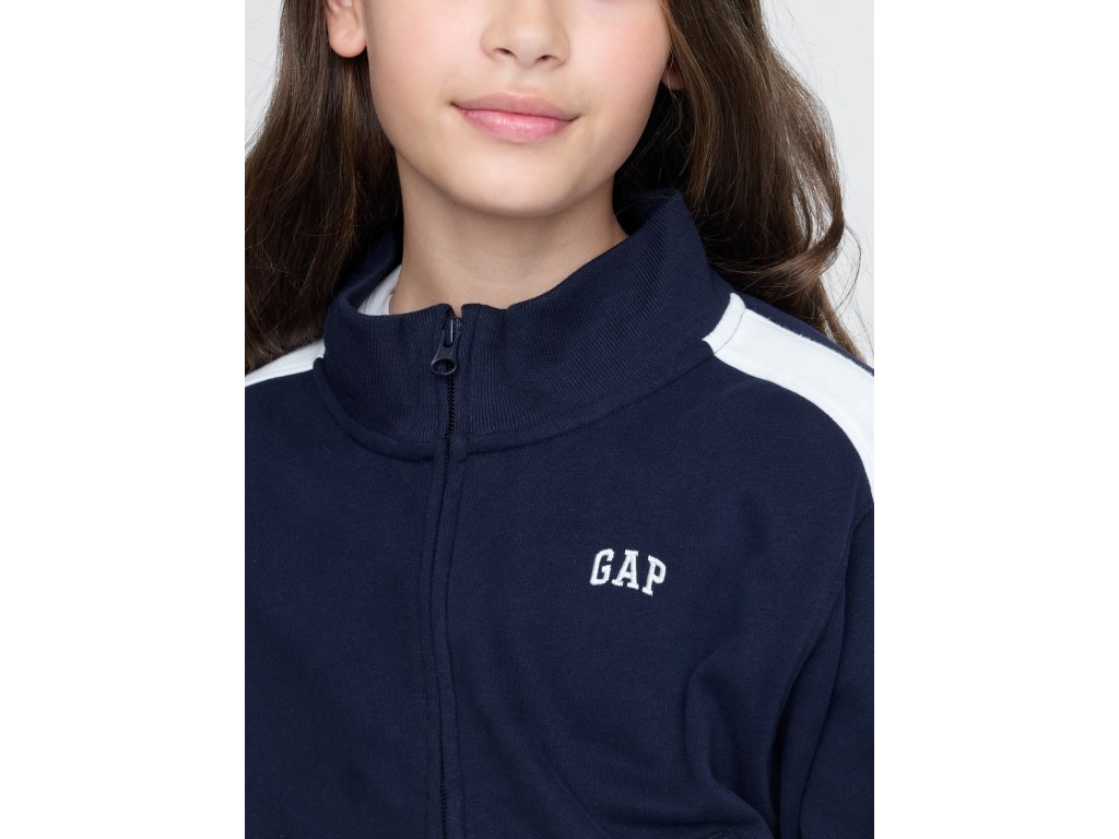 Detská mikinová bunda z materiálu French terry s bavlnenou zmesou je štýlovou a pohodlnou voľbou na každodenné nosenie. Disponuje stojačikom, zapínaním na zips a dlhými rukávmi s detailnými pruhmi, ktoré dodávajú športový vzhľad. Rebrované manžety a elastický spodný lem zaisťujú pohodlné nosenie a udržujú tvar bundy. Na hrudi sa nachádza ikonické logo Gap, ktoré podčiarkuje jej štýl. Predné šikmé vrecká pridávajú praktický detail na drobnosti. Bunda je vyrobená z 23% recyklovaného polyesteru, čo prispieva k znižovaniu spotreby prírodných zdrojov a odpadu. Relax strih je rovný a pohodlný, ideálny pre aktívne deti. Pokiaľ preferujete užší strih, odporúčame zvoliť o jednu veľkosť menšiu.Dodatočné parametre