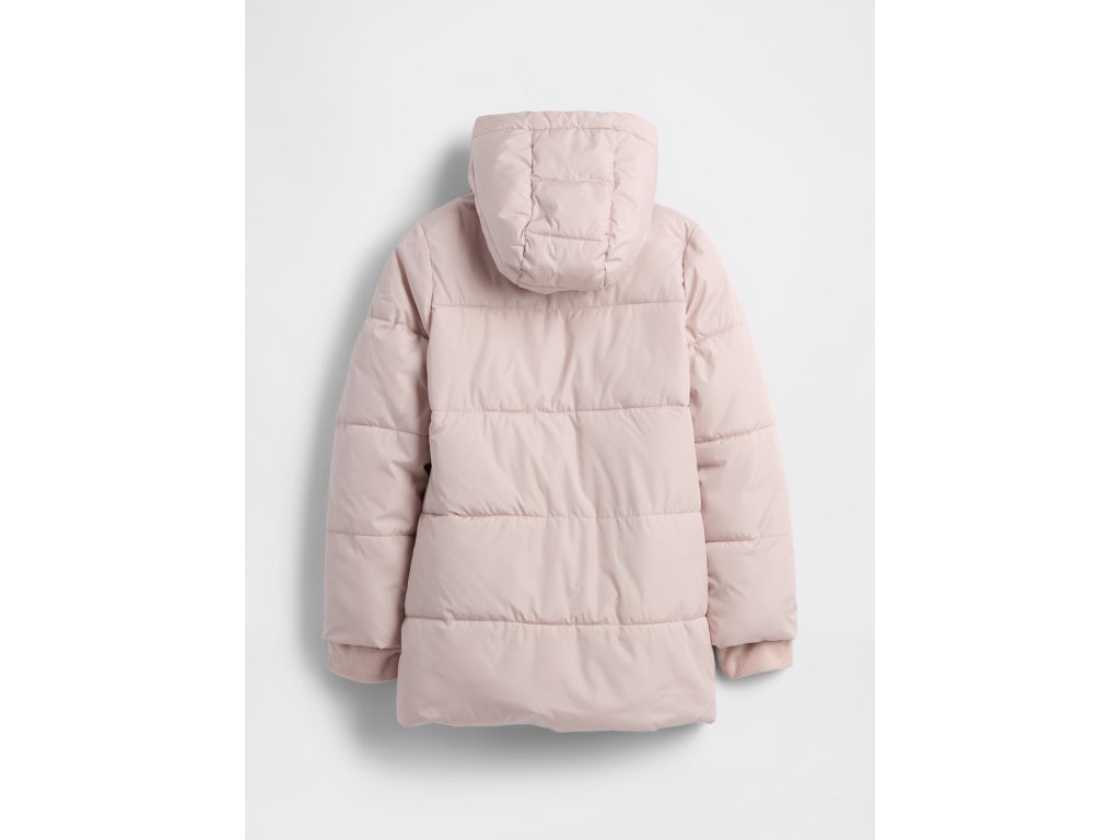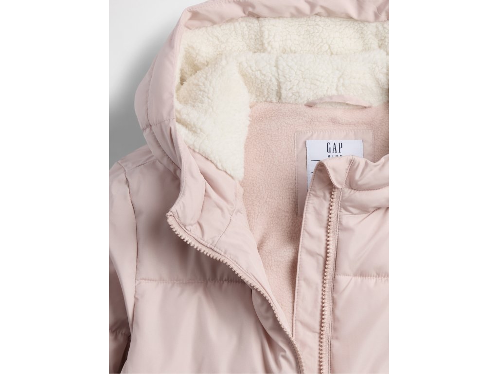 Dievčenská prešívaná bunda s vodoodpudivým povrchom je skvelou voľbou do chladnejších dní. Výplň tvorí 100% recyklovaný wellon – ľahké syntetické vlákno, ktoré výborne izoluje teplo, ale zostáva vzdušné a pružné. Podšívka zo sherpa kožúšku v kapucni a tele dodáva extra mäkkosť a pohodlie. Bunda má kapucňu, dlhé rukávy s pružnými manžetami, praktické šikmé vrecká a zapínanie na zips. Rovný, ležérny strih siaha pod bokmi a poskytuje dostatočné zakrytie aj voľnosť pohybu.Dodatočné parametre