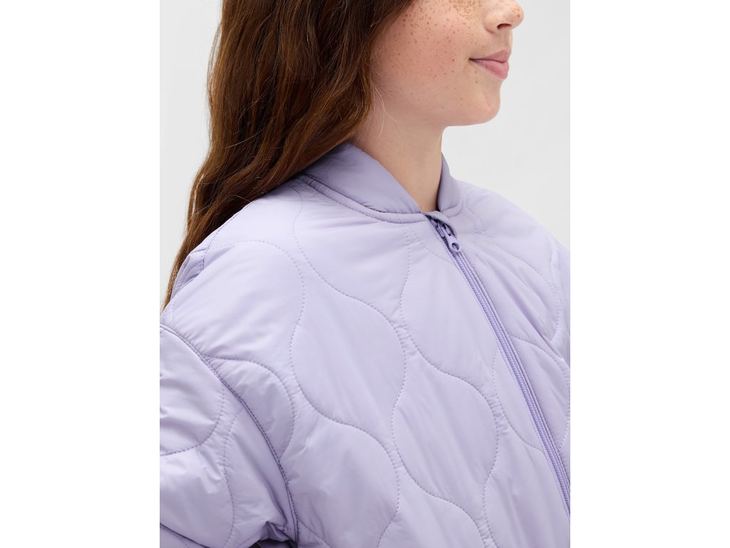 Najľahšia prešívaná dievčenská bunda s výkonnou izoláciou, ktorá spoľahlivo zahreje aj počas chladných dní. Ušitá je z hladkého, vodoodpudivého nylonu zo 100% recyklovaných vlákien. Výplň tvorí 100% recyklovaný polyester PrimaLoft® P.U.R.E.™ – ľahký, hrejivý a odolný materiál šetrnejší k prírode. Celoplošné prešívanie jej dodáva moderný vzhľad. Bunda má stojačik, dlhé rukávy, zapínanie na zips a praktické šikmé vrecká. Mierne skrátená dĺžka siaha do oblasti horných bokov. Oversize strih je voľný a pohodlný. Pokiaľ preferujete užší strih, odporúčame zvoliť o jednu až dve veľkosti menšie.Dodatočné parametre