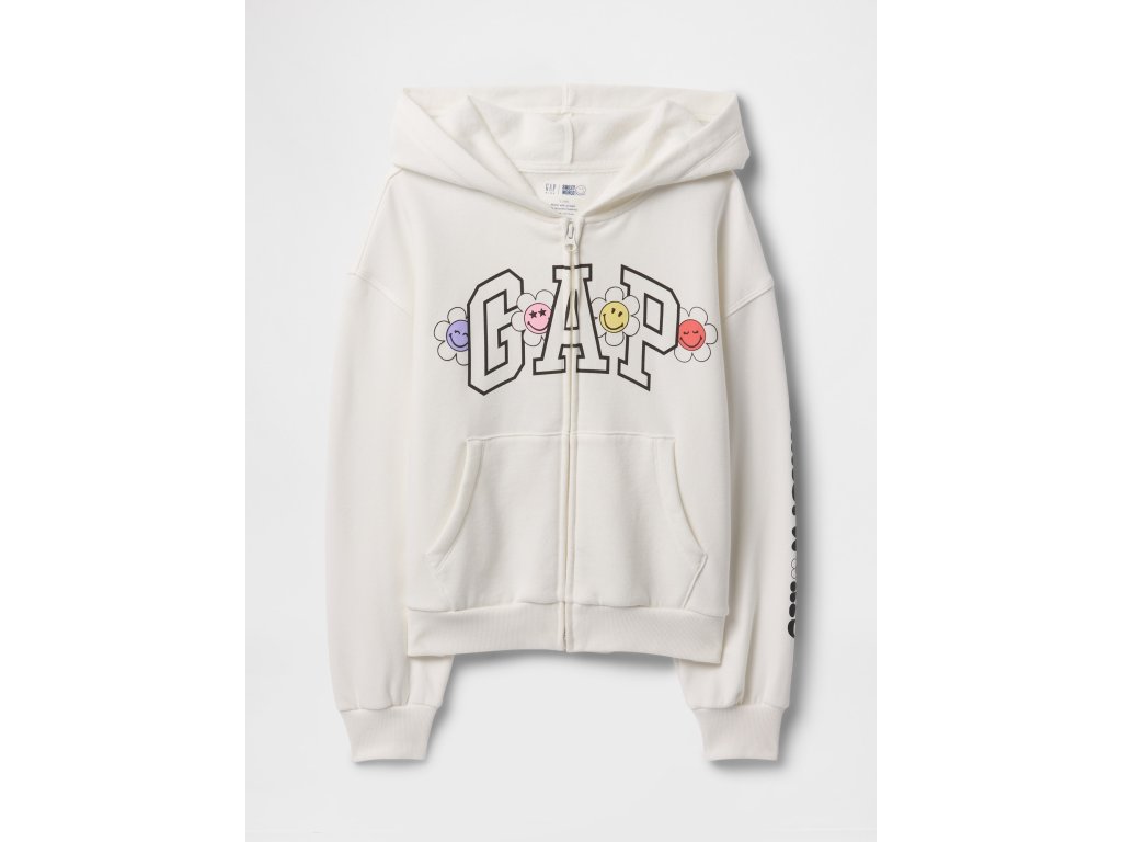 Detská mikina z mäkkého fleecu s kapucňou a zapínaním na zips je perfektnou voľbou na každodenné nosenie. Kapucňa a predné zapínanie na zips zaisťujú praktický a pohodlný dizajn, zatiaľ čo vrecká pridávajú funkčnosť. Prednú stranu a rukáv mikiny zdobí ikonické logo Gap doplnené veselou grafikou Smiley World, ktorá dodáva hravý nádych. Mikina má rebrovaný spodný lem, ktorý drží tvar, a vďaka oversize strihu je voľná a pohodlná. Vyrobená z 23% recyklovaného polyesteru, čo prispieva k ochrane prírodných zdrojov a znižovaniu odpadu. Tento produkt bol vytvorený vo výrobni, ktorá podporuje rodovú rovnosť a posilnenie postavenia žien prostredníctvom programov RISE a P.A.C.E. od Gap Inc. Mikina siaha do oblasti bokov a je ideálna pre deti, ktoré hľadajú pohodlie aj štýl. Ak preferujete užší strih, odporúčame zvoliť o jednu až dve veľkosti menšie.Viac z kolekcie Gap & SmileyWorld® > .