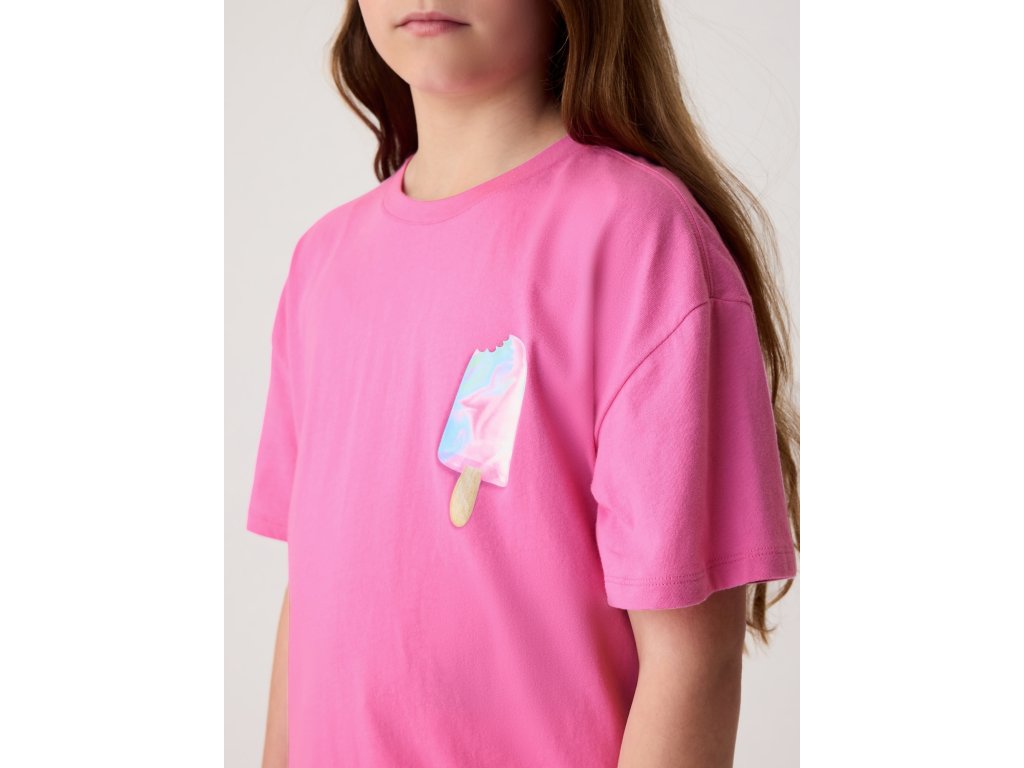 Detské bavlnené tričko. Potlač na prednej strane. Okrúhly výstrih a krátke spadnuté rukávy. Rovný a voľný strih.Dodatočné parametre