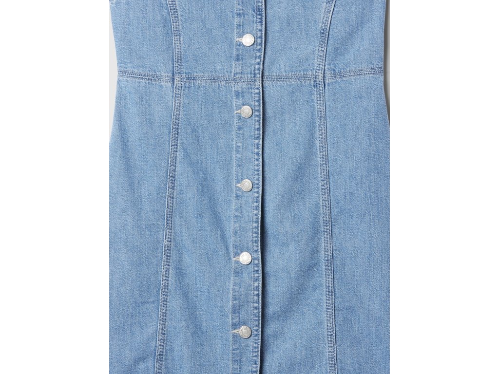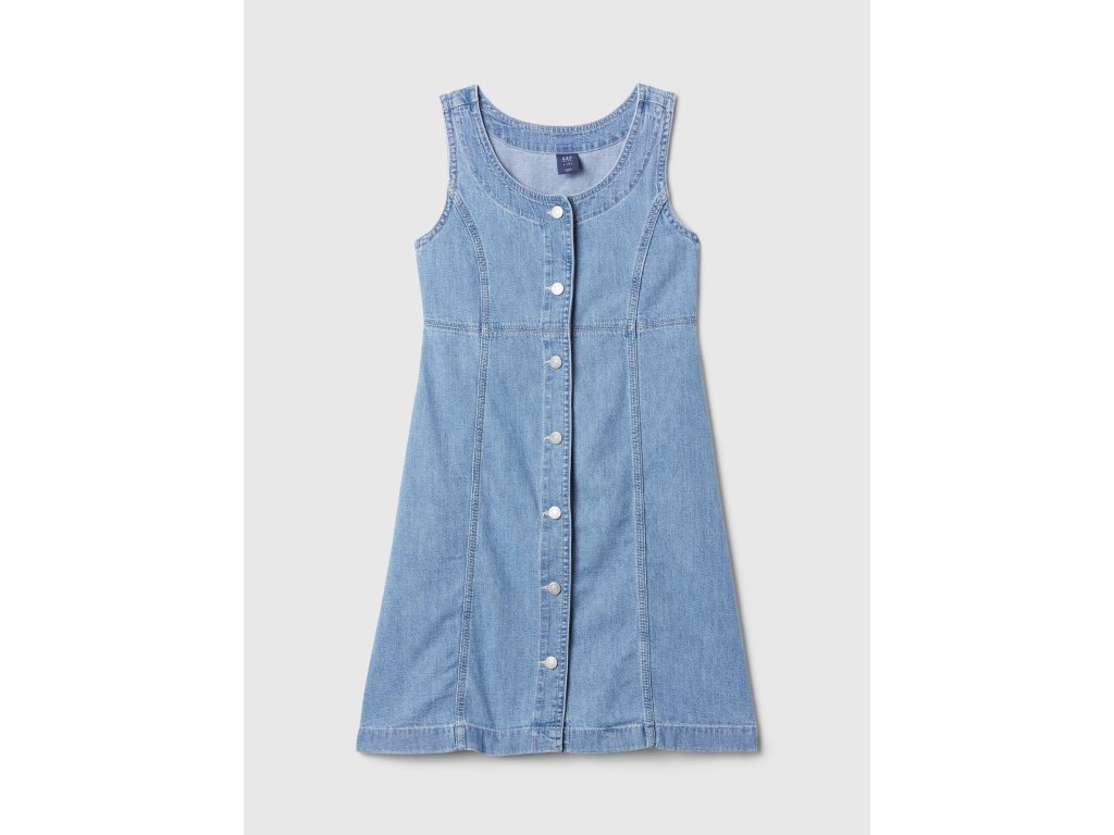 Detské džínsové šaty. Mäkký materiál. Okrúhly výstrih, bez rukávov. Zapínanie na gombíky vpredu. Rovný strih. Dĺžka ku kolenám.Dodatočné parametre