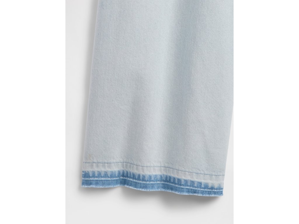 Dievčenské baggy džínsy s vysokým pásom spájajú moderný vzhľad a pohodlie pre každodenné nosenie. Pevný neelastický denim dobre drží tvar a je odolný aj pri častom nosení. Vysoký elastický pás so sťahovacou šnúrkou a falošným rázporkom umožňuje ľahké obliekanie bez zapínania. Svetlomodrá farba dodáva ležérny denimový štýl. Predné šikmé vrecká a zadné našité vrecká sú praktické na drobnosti. Voľný strih cez boky a stehná sa smerom ku členkom mierne zužuje. Vďaka 5% recyklovanej bavlny šetrí prírodné zdroje a program Washwell™ pri výrobe spotrebuje menej vody.Dodatočné parametre