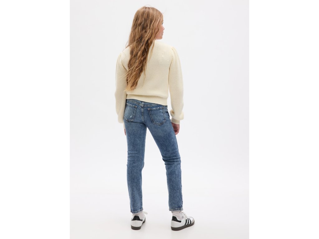 Dievčenské džínsy girlfriend. Viac obnosený vzhľad. Stredne vysoký pás. V páse všitá regulačná guma. Zapínanie na zips a gombík. Klasické vrecká. Možno nosiť vyhrnuté.Dodatočné parametre