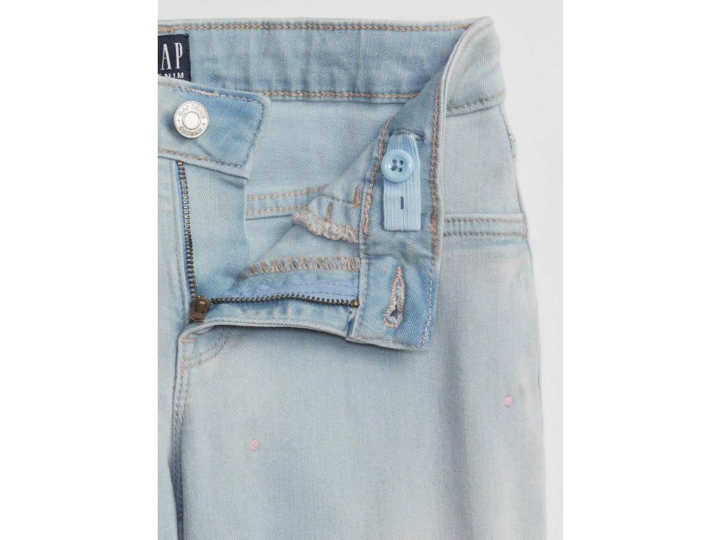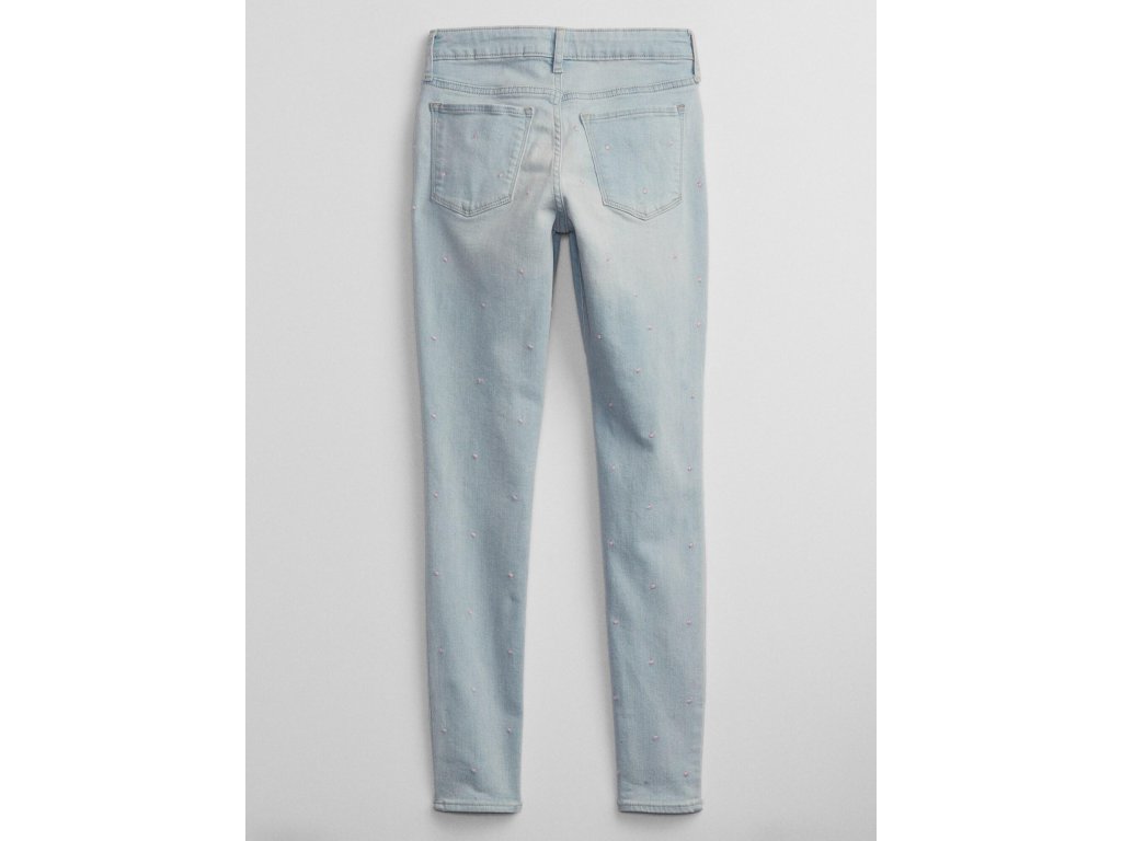 Dievčenské džínsy Gap. Zapínanie na zips a háčik. Zadné vrecká. Vyšité drobné ružové bodky. Svetlomodrá farba a svetlé prešitie.Dodatočné parametre