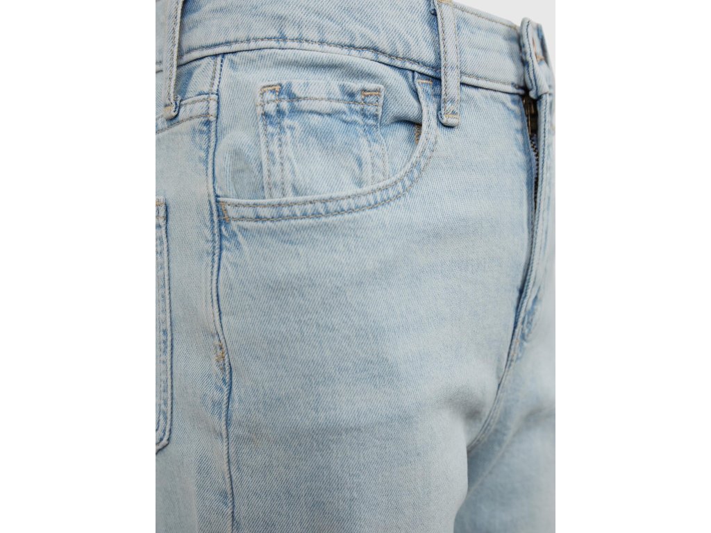 Dievčenské džínsy vo svetlo modrej farbe. Pohodlný strih mom. Pevný pás so zapínaním na zips a gombík. V páse pútka na opasok. Klasických 5 vreciek. Zámerne obnosený vzhľad. 5% recyklovaná bavlna.Dodatočné parametre