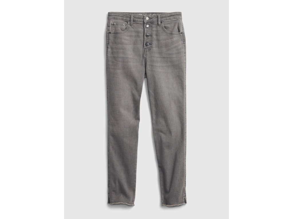 Dievčenské šedé džínsy Gap. Zapínanie na viditeľné gombíky. Pevný pás s pútkami na opasok. Predné a zadné vrecká. Moderný strih s vysokým pásom. Nohavice doplnené o rázporky.Dodatočné parametre