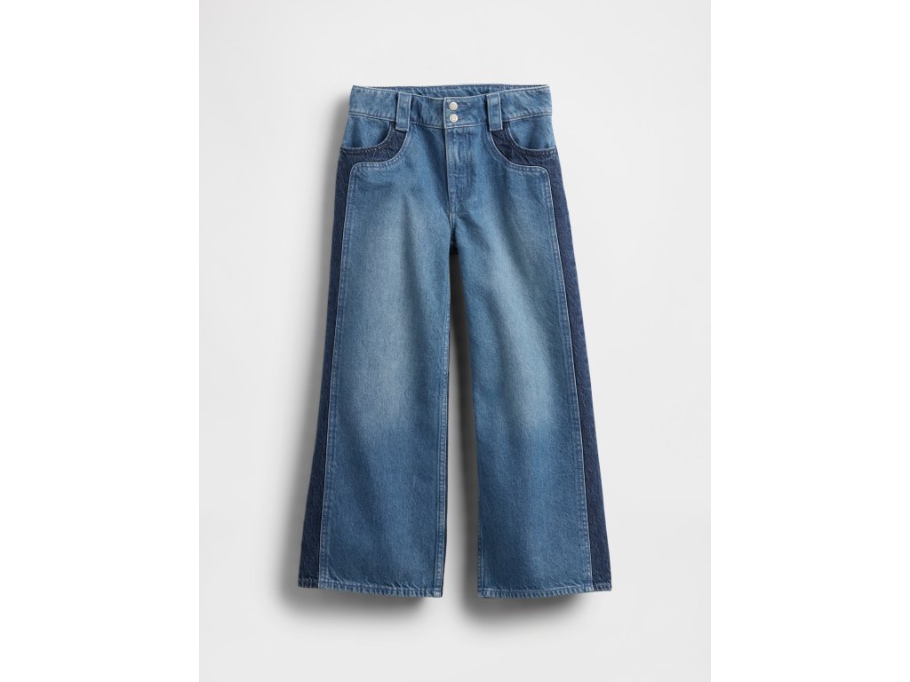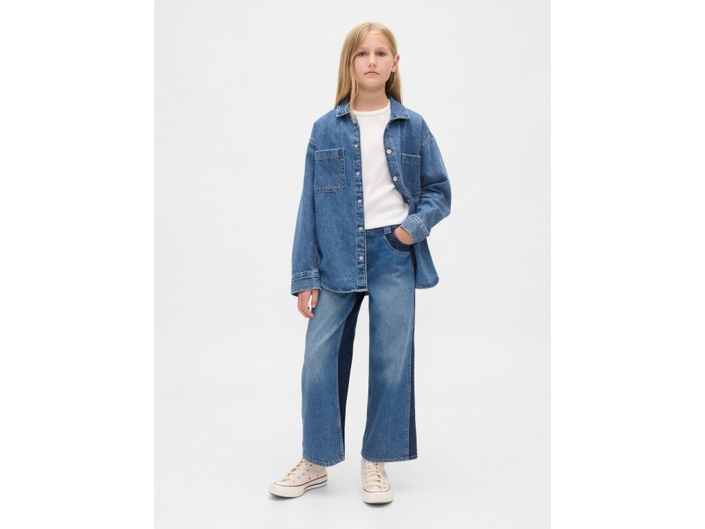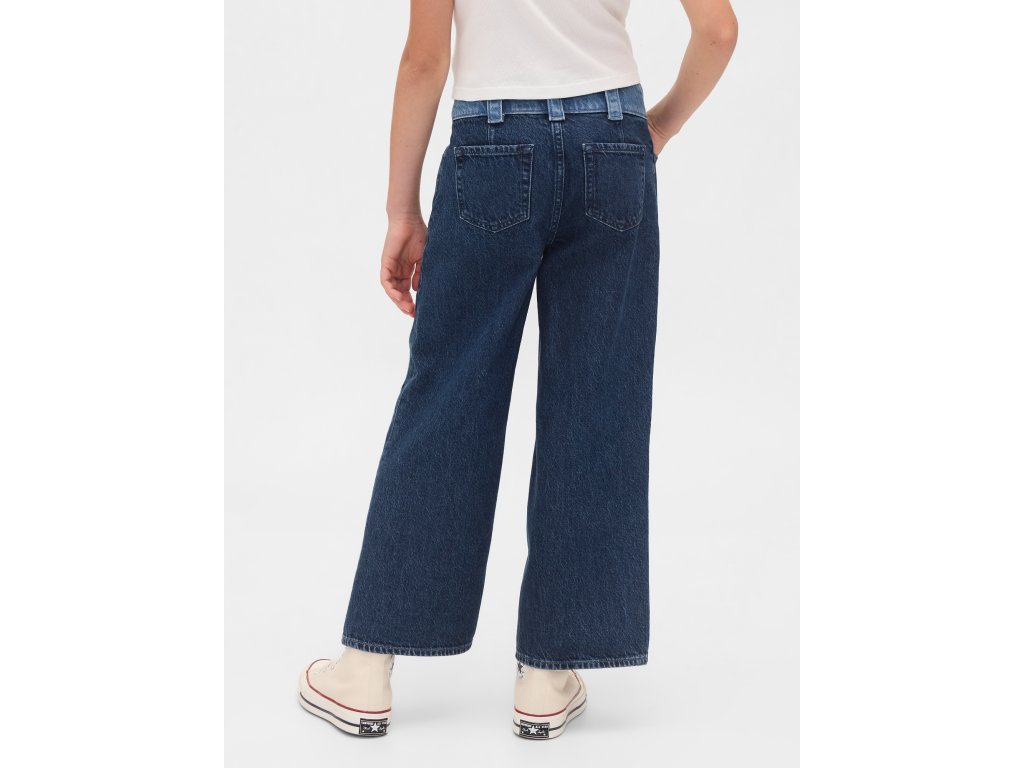 Dievčenské široké džínsy z pevného denimu bez elastanu predstavujú štýlový základ na každodenné nosenie. Dvojfarebná kombinácia dodáva originálny vzhľad, ktorý ľahko vynikne v akejkoľvek kombinácii. Klasické zapínanie na gombík a zips je pri veľkosti 4–8 doplnené háčikom pre ľahšie obliekanie. Dizajn s piatimi vreckami zahŕňa zaoblené vrecká vpredu a našité vrecká vzadu. Strih Classic fit pohodlne sedí v páse, voľnejší cez boky a prechádza do širokých nohavíc siahajúcich ku členkom. Materiál obsahuje 5% recyklovanej bavlny. Džínsy sú súčasťou programu Washwell, ktorý znižuje spotrebu vody, a iniciatívy RISE podporujúce rovnosť žien v odevnom priemysle.Dodatočné parametre