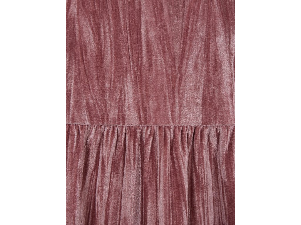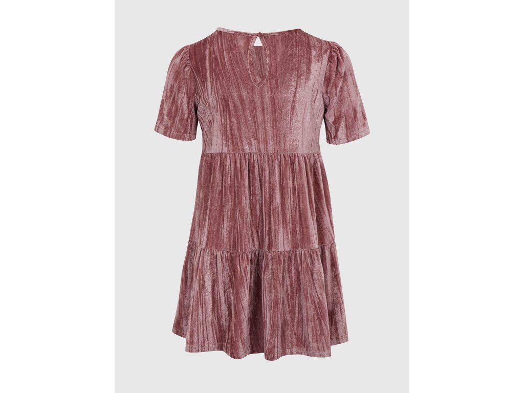 Dievčenské zamatové šaty. Okrúhly výstrih a zapínanie za krkom. Krátky rukáv. Naberané volány.Dodatočné parametre